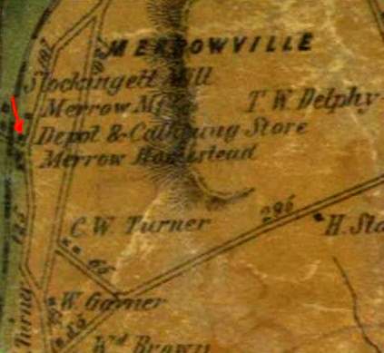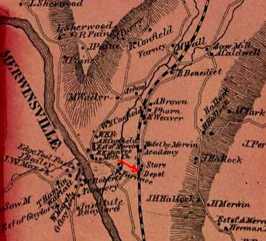 As seen on the 1854LC map, this stop in the town of NEW MILFORD was first called GAYLORD'S BRIDGE for the Galliard/Gaylord family settlers. Much has been made of local entrepreneur Sylvanus Merwin's buying of property east of the village center to capitalize on the coming of the railroad, by profiting from the land sale for the right of way, by building a trackside hotel with ticket office and waiting rooms, and by signing a railroad meal-stop contract that lasted until 1877. The renaming of the station as MERWINSVILLE probably had less to do with the railroad deal, as is generally thought, than with the appointment of the ambitious Merwin, already station master, as postmaster in place of John Gaylord. The post office was moved to the hotel and the name was changed from Gaylordsville to Merwinsville, with the HRR consequently renaming the stop. The gap in our timetables from 1852 to 1857 allows us to only first see this change in 1858. While the post office designation would be changed back with the reappointment of Gaylord in 1861, the station name would remain MERWINSVILLE for the next half century. [REFS: RF/02/15/1843/02; 1851TT; HDC/07/09/1853/02; PTH107.1858.15; Samuel Orcutt, History of the Towns of New Milford and Bridgewater, Connecticut, 1703-1882, p384+; C56; R55; NL9.7.7]