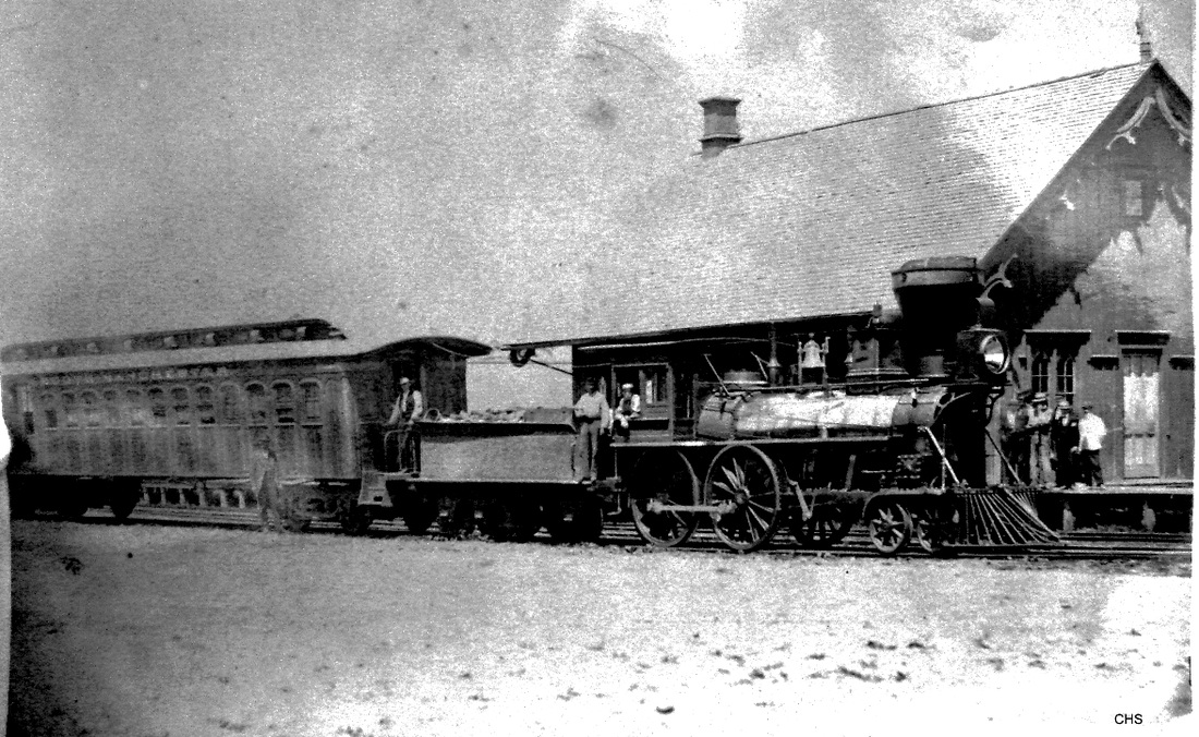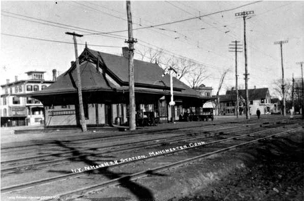 The first name for this stop when the HP&F opened in 1849 was UNION VILLAGE, as is seen on this 1855HC map at left but an 1851TT, however, already lists it as MANCHESTER. The station structure is seen on the Bailey 1880 bird's-eye map at middle. The train that is approaching is on the South Manchester RR and has just come up from the Cheney factories, which the tiny railroad connected to, by then the NY&NE main line. The timing of this sketch was fortuitous for, had the Bailey artist arrived in 1881 after MANCHESTER2 was built, we would not have this image of the first station. Click here for the LOC map collection. The photo at right was a lucky find at CHS. Although the sketch image shows two chimneys at the time it was done, it otherwise seems to match the photograph, right down to the trim design on the bargeboards.