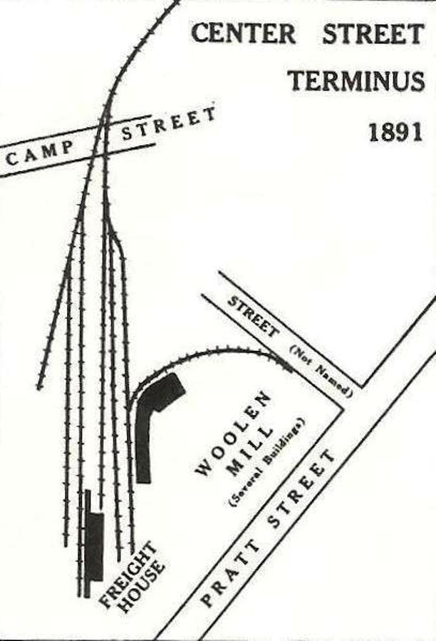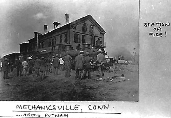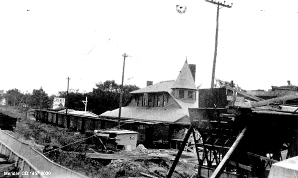 This was the depot opened by the Meriden and Cromwell RR on Center St., just off Main St., in 1885 and served as its freight and passenger terminus. The photo at [1] was taken on 8/12/1902 after fire damage; this is the only photo we have ever seen of this structure. The map at [2] is from 1893 and the snippet at [3] is from the 1918 aero map [click here]. The map at [4] is from Snow's history of the MW&CR. [REFS: S14][rev083019]