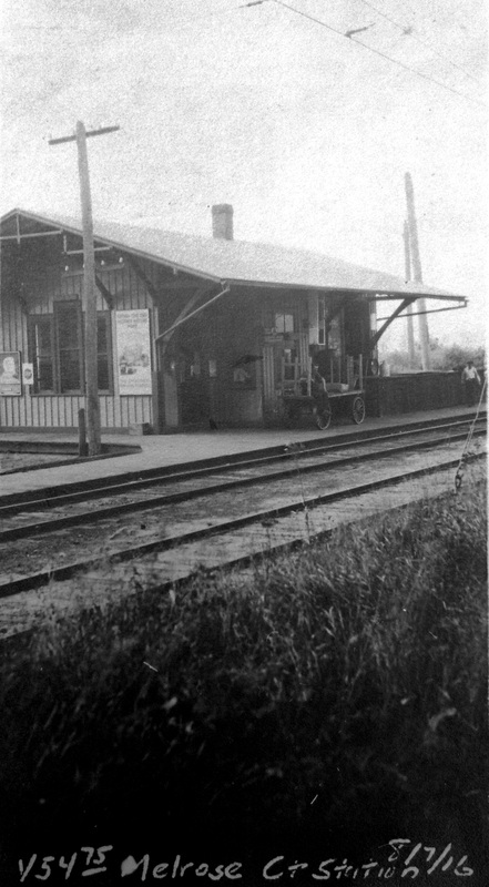 This new station was built in 1897 after the old one burned. The image at [1] is a Lewis H. Benton shot #2362, probably from 1927, with Irving Drake's sedan front and center. The 1915 val map at [2] has the depot in the northwest quadrant of the Ellington Rd. grade crossing and shows the layout of the station grounds, including the turntable and the Melrose branch track. The heavy dashed line is the Rockville, Broad Brook & East Windsor Street Rwy that opened in 1906 from Warehouse Point to Rockville, with a car on the bridge seen in the shot at [3]. The image at [4] is an 8/7/1916 val photo of MELROSE2. From 1908 to 1914 there were electric cars on the Melrose branch as part of the Rockville interurban service. By 1928 when branch service was ending, there was a hearing on the NYNH&H's intended closing of this station, in spite of service on the CC being continued into the late 1930s before conversion to bus. The PUC granted the public's request for the station, also the post office, to remain open in spite of the fact that this would no longer be a junction point for trains to ROCKVILLE. [REFS: CRC45.1897.23; HC/08/08/1928/05][rev050317]