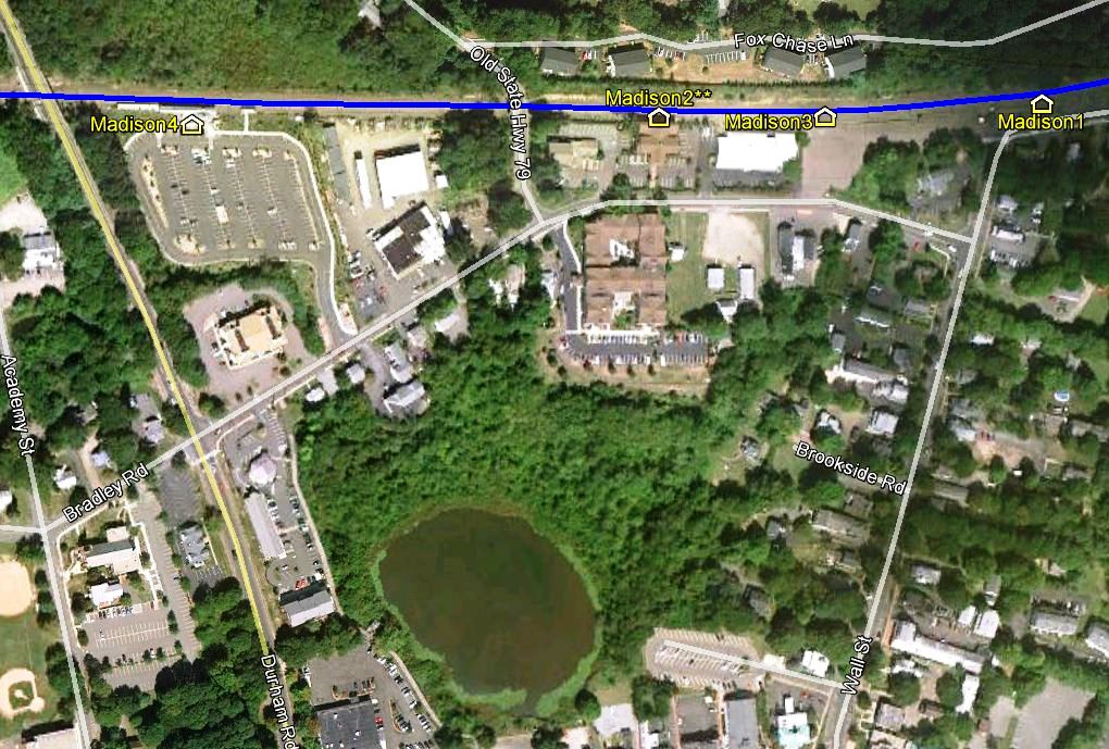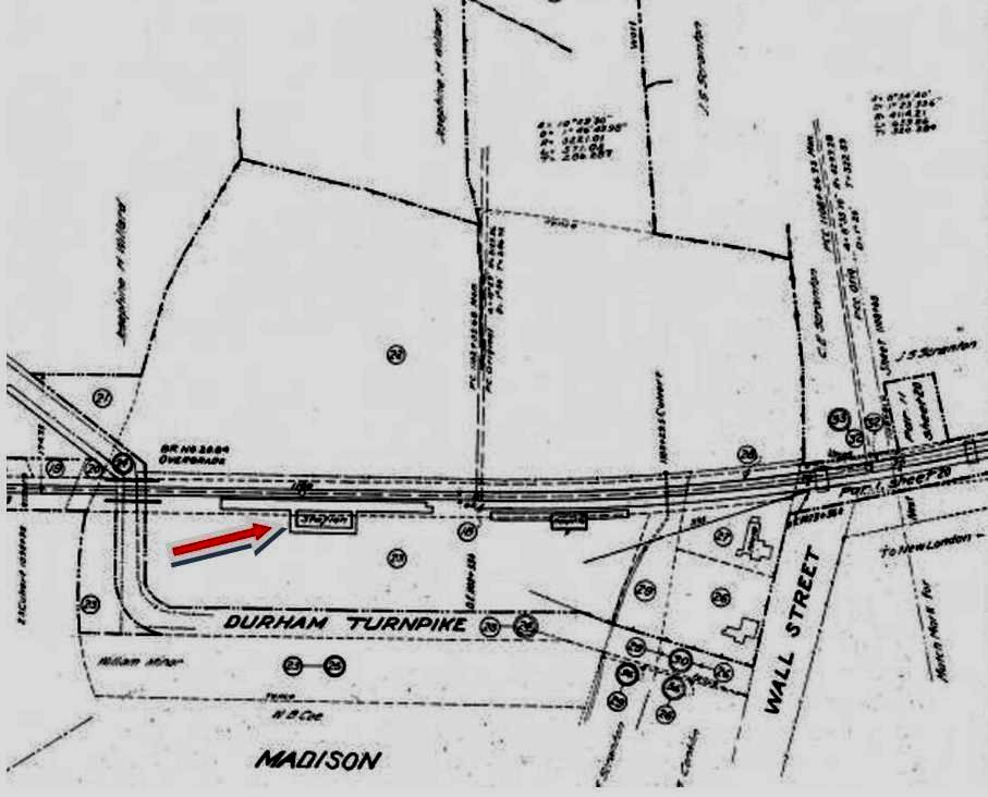 This stop was established when the NH&NL opened on 7/1/1852 and the first depot was likely built in that year. The image at [1] is from the 1881 Bailey bird's-eye map [click here]. The depot pedigree is authenticated by the compass ornament that the NYP&B affixed to the stations when it was lessee of this line from 1858 to 1862. This decoration has been noted in photographs or on the Bailey maps for all the early NH&NL depots, e.g. NOANK, WEST MYSTIC, several of which are extant and still sport this detail today. The view at [2] shows a New London-bound train ca. 1890; note the circular switch shanty in the foreground. The location of this first station was at the intersection of Wall St. and Railroad Ave., as seen on the 1868 Beers map at [3]. MADISON1 was moved slightly west to become the freight house when MADISON2 was built in 1896. The val photo at [4] is dated 4/11/1917. Info on the back of the shot at [5] says this is 1985 when the freight station "was moved to the swamp behind 56 Wall Street and afterward demolished." This happened in spite of a Railroad Depot Committee that was formed to dismantle, relocate and restore the venerable structure in 1986. It was, nevertheless, the model for the Senior Meeting Center or 'The Depot' which is at 9 Old Rte. 79. The snippet at [6] is from our Track 11 Google Earth map and shows the locations of all the stations over time. [REFS: SLT/05/01/1986/00; R63][rev032215]