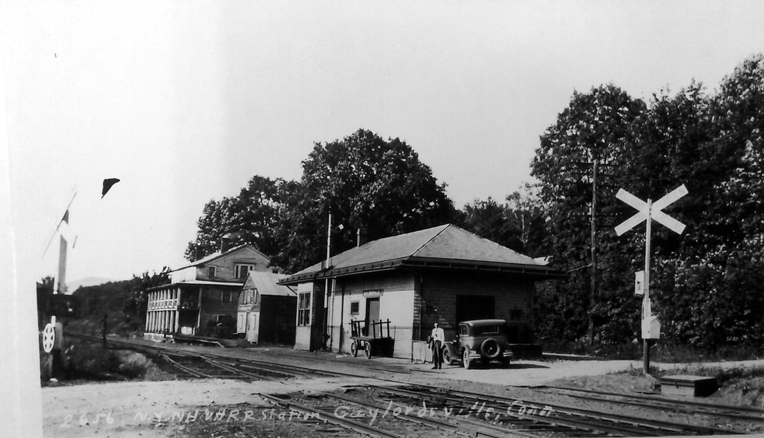 A new combination station in 1915 replaced the converted freight depot that was moved to become LIME ROCK2. In spite of the bad feeling between Hurd and the railroad, the name of the stop was not changed back to GAYLORDSVILLE until 1918, reportedly on February 1. Timetables seem to bear this out. The PUC photo at [1] is dated 10/13/1925 and the shot at [2] is Lewis H. Benton's #2656 taken on 6/22/1930; Irving Drake is posing with the sedan that transported the pair on their photographic adventures. Order boards are down both ways in the undated, southward-looking shot at [3]. The image at [4] appeared in the newspaper when this station was purchased from the railroad in 1968 and moved in the fall of 1971, about 1,000 feet south and to the east side of the track, to be used as a private home. The saga is in the New York Times article that tells of the later acquisition of a caboose to complement the station. The tale of the depots built here and their successive renamings is unique enough historically, but even more remarkable for the fact that the hotel, the converted freight depot that became LIME ROCK2, and the final combination station all still stand today in 2019. [REFS: PTH925.1917.32; NHAR45.1916.10; NYT/01/02/1971/R1; NYT/11/10/1971/01?; D70; R54+][rev070315, 083019]