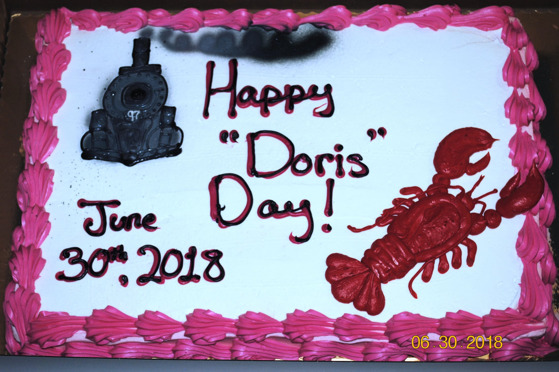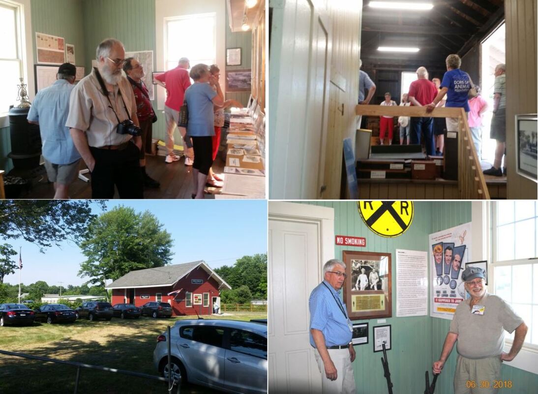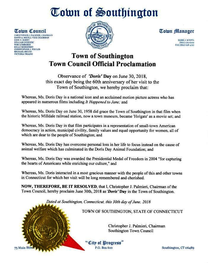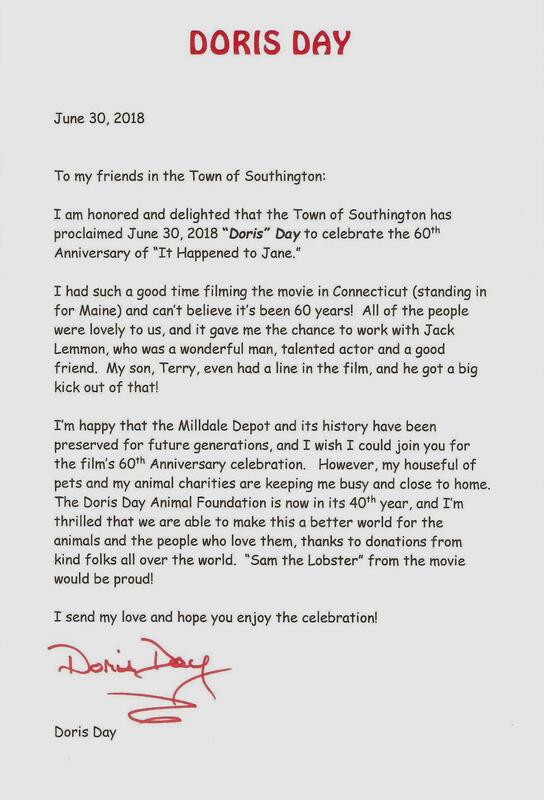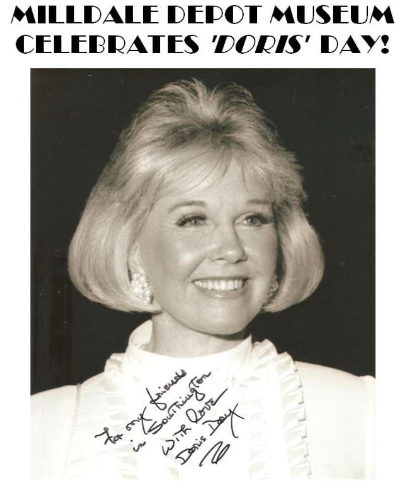 MILLDALE2 played a cameo role as HOLGATE in the 1958 filming of the movie It Happened to Jane. We have suggested that the Southington Historical Society show the movie as part of a reunion of the many local folks who stop at the museum and tell us their memories of Doris Day and Jack Lemmon being in town. The 60-year-to-the-day anniversary of the filming was celebrated in 2018 by town proclamation of 'Doris Day' on June 30. Ms. Day sent an autographed photo and letter of thanks to "My Friends in the Town of Southington," acknowledging the honor and expressing her gratitude for the Milldale Depot Museum project. Sadly, at age 97, Doris Day passed away on May 14, 2019. We were blessed to have been able to have her as part of the celebration which included a presentation at the Southington Public Library and a tour of the depot. It must have been the highlight of Stationmaster David K. Lienhardt's half-century railroad career when he and wife Augusta had Jack and Doris over for lunch at their beautiful garden and koi pond. Their house, recently demolished, stood next door to the station. A 'Doris Day' search party from the depot was sent out and successfully discovered in the reeds behind the house the bench on which Jack and Doris sat. It was later brought to the MDM where it awaits a plaque and relocation to a place of honor on the depot property. The sheet cake was donated by Stop & Shop; bakery decorator extraordinaire Natasha took the movie still we gave her of the Old 97 and recreated it beautifully, with '97' on the head end and smoke wafting from the stack. Anyone who has seen the movie knows why the lobster is there. If you are a NH railfan and you haven't seen the movie, you are missing out on a great treat, neat train scenes and trip back to a time when there was civility and sanity in the world. There is much more to tell about Doris, the movie and the depot when you come to visit the MDM! The building is open on summer weekends from 9-4. Call 203-913-9630 to make sure a docent is there to give you the tour. [rev082619]