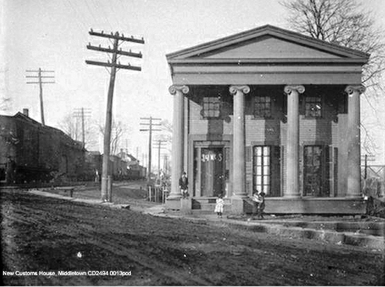We have listed this CV station here for its location on Washington St. adjacent to our previous entry. Its railroad career spanned 1871 to 1884. The first we hear of it is in August, 1871 when a newspaper article said that "the depot for the present in this city will be at the foot of Washington street in the old Brooks' house, next west of Willard & Haskel's store. Mr. Buckley Bacon has been appointed depot master..." In September, 1872 another article probably referred to this building when it said a "dwelling house" had been obtained for use as a temporary depot and that citizens had signed a petition for a permanent one at the foot of William St. This structure was in service until 6/17/1884, according to Max Miller's research in the Middletown Constitution and it is seen as a dwelling already on the 1884 Sanborn map at [3] in our previous entry. An 1885 Courant article tells us that "the long platform at the old depot of the Valley railroad has been removed this week," thus transferring all passenger service to MIDDLETOWN/J2 as the new union depot for the city's three railroads. In years from 1872 to 1884, therefore it is likely that CV trains were making stops at the junction as well as here. The 1874 Beers map at [1] shows this station and its 'long platform' at the red arrow. The image at [2] is the 1915 Bailey map [click here] and shows this depot next to MIDDLETOWN/H2. The 4/30/1924 PUC shots at [3] and [4] look north and west respectively. The val photo at [5] was taken on 5/23/1924 when the building, still railroad property, was apparently under lease as the 'New Custom House' after the old one was razed in 1916. It is seen so labeled in [6], with a string of freight cars to the left and the Connecticut River bridge glimpsed to the right. [REFS: MDC/09/02/1863/02; MDC/06/19/1867/02; MC/06/05/1872/02; MC/09/04/1872/02; HDC/01/07/1885/04; C169][rev020615]