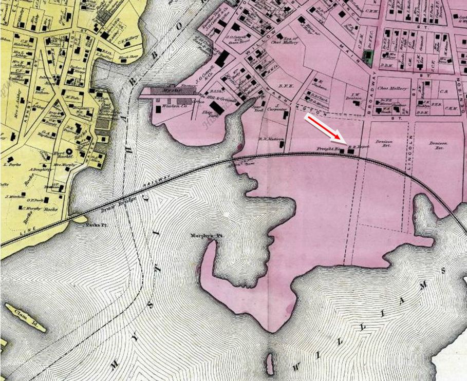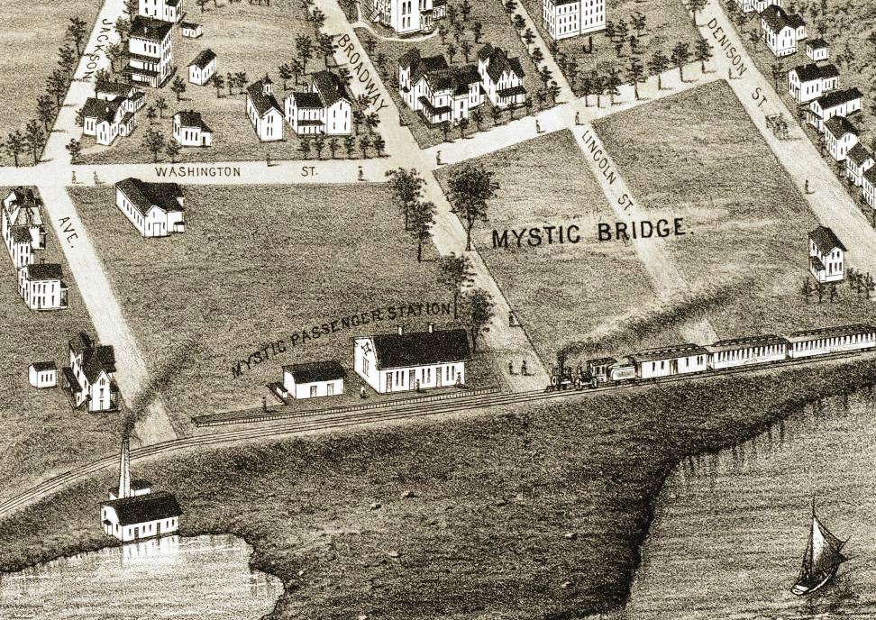 Also known as MYSTIC BRIDGE. Based on the NYP&B annual report [p121] for the year ending 8/31/1867, a new station was built here "to replace the one burnt." That fire occurred on Wednesday, July 4, 1866, in what was probably not the first and certainly not the last Independence Day to see a railroad station accidentally consumed by flames. The cause of the fire was "the day we celebrate," according to the Courant and the value of the lost building was put at $3,000. The snippet is from the Bailey bird's-eye map of 1879: click here. [REFS: HDC/07/07/1866/04; SR/07/14/1866/01]