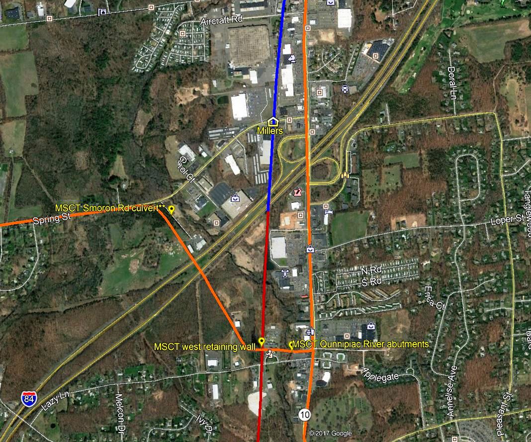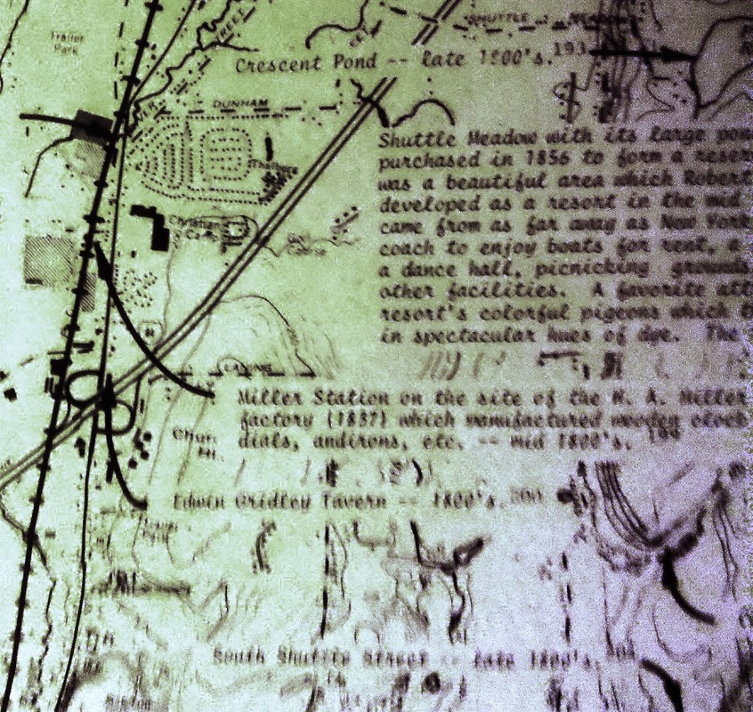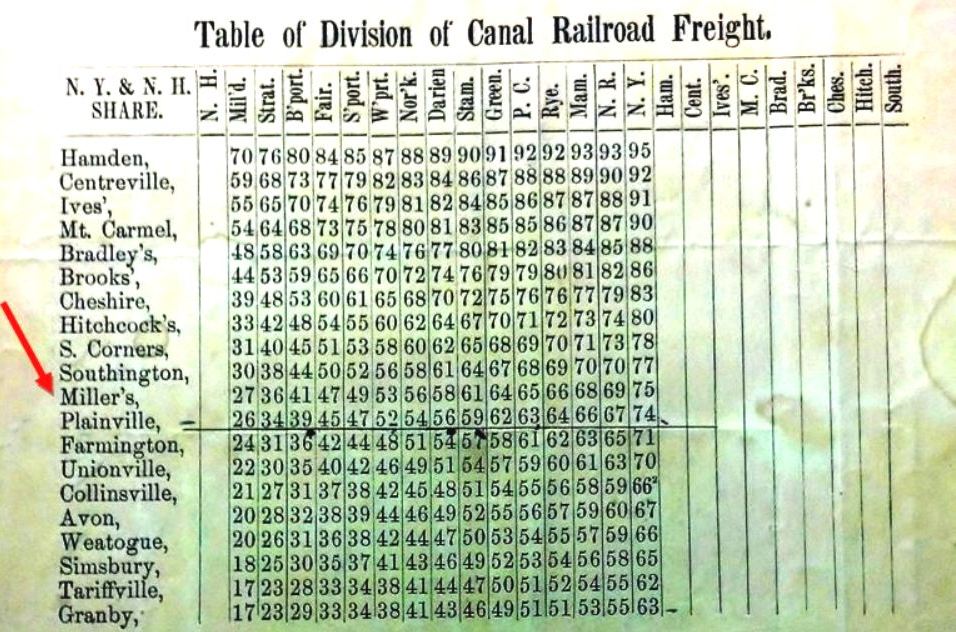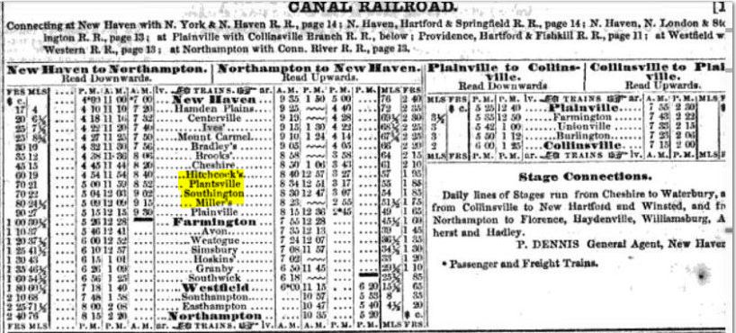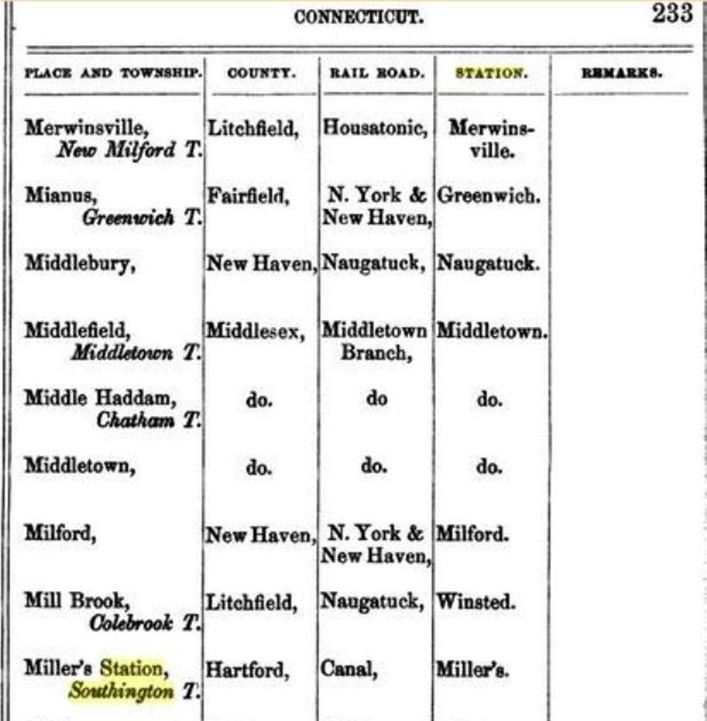 This obscure and short-lived Canal line station does not appear on anything we have from 1849 to 1854 but it is seen on the 1855 Colton map of Connecticut at [1] and the 1858TT at [2]. The map at [3] is from the Southington Historical Society and shows the location of this station, perhaps on Spring St. just above where today's I-84 crosses Queen St. The map info says that the H. A. Miller Clock Co. was founded in 1837 and lasted until the mid 1800s, making wooden clocks and later metal products. W.R. Wilbur says that Henry A. Miller partnered in 1848 with Lewis Merriman and "... built a factory at what was afterwards known as Miller's Station on the New Haven and North Hampton Railroad, where they engaged in manufacturing carriage bolts, brass shovels, tongs and other articles, making a specialty of the bolt business..." The venture ended in the mid-1850s when the machinery was sold, ''... divesting Miller's Station of everything but its name and solitude." What exactly was here in terms of railroad accommodations and precisely how long the stop lasted is unclear. We do know that during the NY&NH lease of the Canal line from 1848 to 1869 several smaller stations like ALLENS in Avon and BROOKS in Cheshire were maintained for freight service and as passenger flag stops, sometimes not seen on public timetables. The PLANTSVILLE controversy of the 1870s makes no reference to a fourth station in Southington, more evidence that it was gone by then. The stop is still seen on the 1858 Geers directory at [4] but it is gone by our 1870TT (not shown). The 1855 revenue-division sheet at [5] shows that the NY&NH got a 27% cut of the take, the Canal line getting 73%, on freight shipped from MILLERS station on the Canal line to MILFORD on the NY&NH. The snippet from our Track 11 GE map at [6] shows the end of track in the ground today as blue, abandoned as red and trolley lines as orange. Coincidentally, the 1994 Canal line abandonment north from Cheshire stopped here, just below I-84, and Pan Am Southern still serves customers along the line today up to the junction at Plainville. Many thanks to archaeological and preservation historian Bruce Clouette for much of this new information. We are always happy to have contributors add to our research! [REFS: B278; GED (1858), p233; W.R. Wilbur, History of the Bolt and Nut Industry of America (1905), p45-46][rev101617]