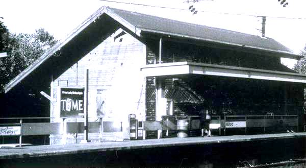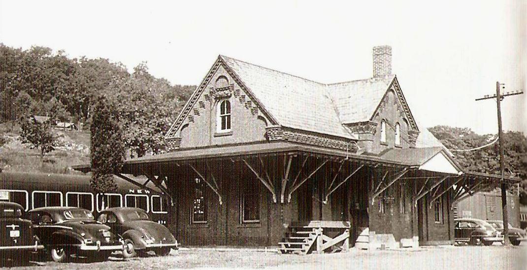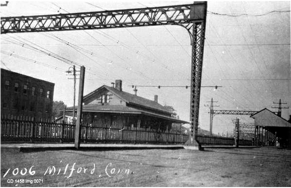 This station was built in 1881 on the eastbound (south) side of what was by then the double-tracked line to New York. The Palladium reported that the foundation walls were up in July, 1881 but that work had stopped "on account of the scarcity of brick" that was supposed to come from the "North Haven yards." Another article in September said that "... At Milford the new brick station house is nearly completed... the new building is 25 by 90 feet, is of brick and is fitted with all modern improvements. It will cost from $6,000 to $7,000." Work was finished for a late November opening with the Courant reporting that "the new depot of the New York, New Haven and Hartford road at Milford, a neat brick structure, was opened for public use Monday [11/21]." [REFS: NHJC/04/15/1881/02; NHDP/07/02/1881/04; HDC/11/22/1881/04; NHAR10.1882.6; R64][rev080915, 110320]