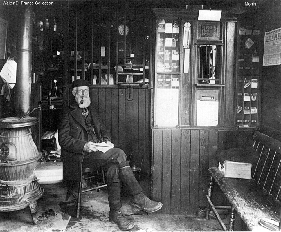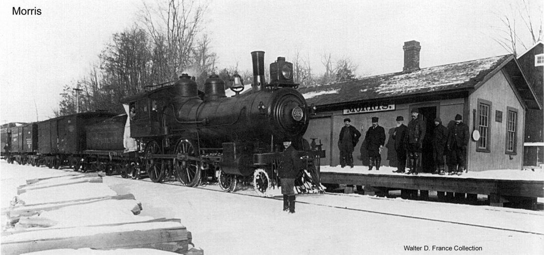 This is the only structure we have seen for a purpose-built station here in Morris and it probably is the one that the railroad commissioners mention as being built in 1886. This is certainly the one that lasted into the 1900s since the locomotive in the photo at upper right was renumbered as the 502 in 1905, according to Fisher. The photo at lower left reportedly dates to 7/11/1913. The interior shot at lower right is fascinating, but undated. [REFS: HDC/08/08/1873/04, HDC/8/15/1873/04; CRC34.1886. 12; Steam Locomotives, p.51][rev032313]