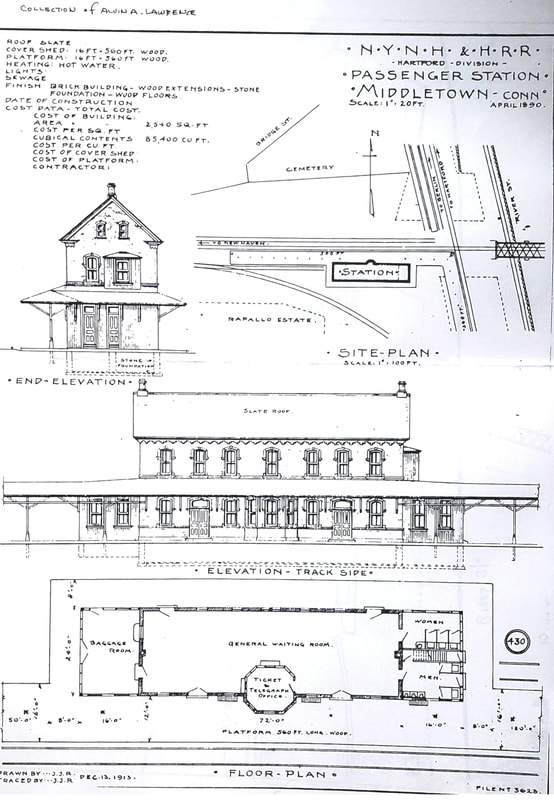 The B&NYAL took the initiative here after the CV rejected plans in 1875 for a union station and the railroad commissioners met in Middletown on 4/22/1881 to locate a site "near the junction of the Air Line and Valley roads on the flats between the present decidedly inconvenient depot and the river... just west of the present stopping place." The Hartford Weekly Times said in August, 1881 that "the building will be seventy-two by twenty-four feet, standing lengthwise, northwest to southeast... two stories high, built of brick and furnished with all the modern improvements... A large sitting room for passengers will be on the first floor, also baggage room and ticket office. The directors room will be in the second story facing east and the other rooms will be used for offices... The building will be a handsome one. The windows and doors are to have Portland brown stone and black brick trimmings..." Max Miller tells us from the Deep River New Era newspaper that the station was first occupied on 12/9/1881 and the painters finished up on 1/19/1882. The ever-expanding NYNH&H leased the B&NYAL on 8/31/1882, got majority stock control of the CV by 10/1/1882 and in November, 1884 built the link to allow branch trains to access what finally had become a union station for all of Middletown's railroads. Karr says passenger service ended on the CV by 1931 and on the Air Line by 1937 but our references say there was NETCo bus service on the Air Line by 11/18/1928 and only Berlin branch service otherwise. By 1938 a Courant article says tickets could still be purchased at Middletown which "for some time has had no passenger service from the 'New Haven' road" and trains had to be accessed at BERLIN via shuttle bus service from here. The Middletown Press reports that the station closed 11/9/1939, with only Railway Express Agency quarters remaining in that building for the time being. In spite of protest from the town, the NYNH&H went ahead with demolition plans that commenced on 6/10 and ended on 6/21/1940, thus eradicating the 60-year-old landmark which the newspaper recalled had once hosted the Ghost Train on the fastest route to Boston. That NY&NE train is seen ca. 1895 at [1]. The view at [2] is a card postmarked 3/16/1917. The 1915 val map at [3] shows the depot at our red arrow, a transportation hub of rail and trolley lines. The postcard at [4] shows a local streetcar at the station. The view at [5] is Lewis H. Benton's #2131 taken in June, 1928 and looking south. SS F-279, controlling the junction, is in the foreground and a gas-electric bound for Berlin is also seen. The shot at [6] looks north and shows the southwest quadrant track that likely came in 1881 with this structure. The 12/13/1913 architectural drawing at [7] is dated April, 1890, which is not in agreement with other sources. This copy was found in the papers of the late Ed Sweeney of Norwood, MA and supplied to us by long-time TCS contributor Richard Fleischer of Newton Centre, MA. [REFS: MC/11/10/1875/02; NHER/04/25/1881/04; RRC12.114 (5/10/1881); NHER/06/25/1881/01; NHER/07/12/1881/01; NHER/07/21/1881/01; HWT/08/18/1881/03; NHER/08/23/1881/04; NHER/11/12/1881/01; NE/12/09/1881/00; CRC29.1882. 15,29; NE/01/19/1882/00; HDC/06/30/1882/02; HDC/09/07/1882/04; HDC/11/01/1882/02; HDC/05/29/1883/04; HDC/12/06/1883/04; PP/10/31/1884/04; PP/11/01/1884/02; HDC/11/07/1884/04; HC/05/21/1891/06; HC/12/12/1928/15; HC/05/24/1938/03; MP/11/09/1939/01; MP/11/11/1939/Mag; HC/11/07/1965/ 10A; K90, 98][rev050315, 103021]