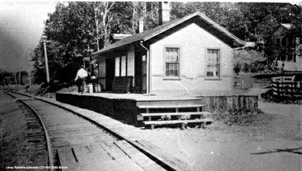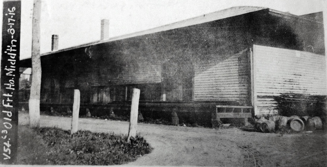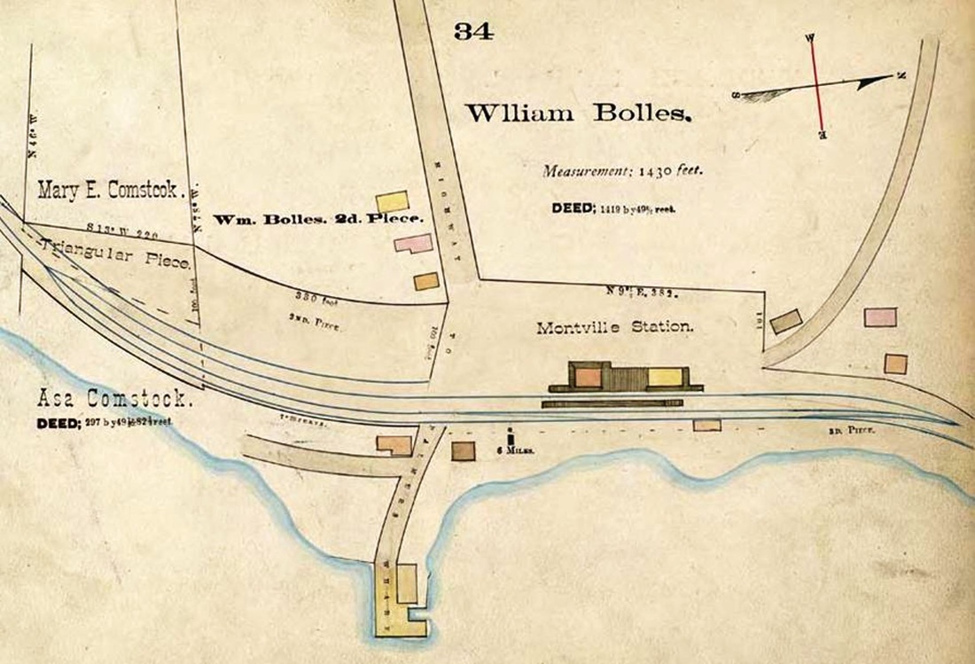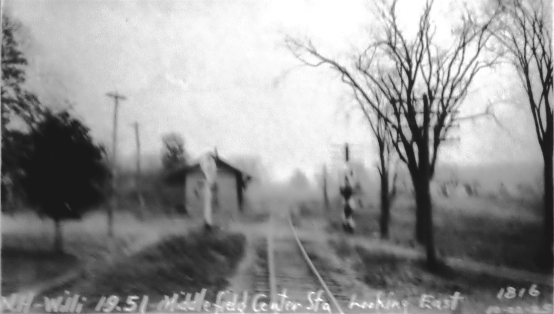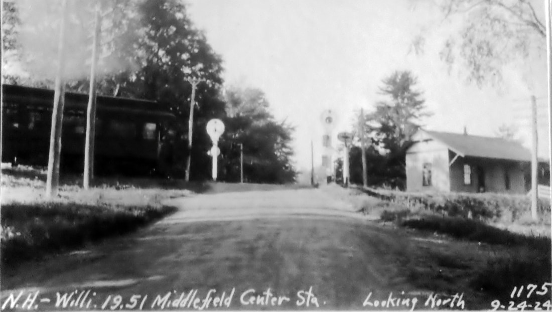 This stop was established in 1870 when the NHM&W opened. The Register reported in August that this depot, measuring 55x22 feet "with a large platform on both sides" was up and would soon be finished. The real estate map at lower left is from 1886 and our red arrow points to the depot. The siting of this station was somewhat controversial. The railroad commissioners ruled for this location in the Falls District, near the house of Ira N. Johnson. Dissatisfaction persisted until a depot was also established at MIDDLEFIELD CENTER, as many had wanted to begin with. If the enlarged freight area in the third shot, an 8/17/1916 val photo, is any indication, there was plenty of need for service here, both initially and in later years. [REFS: RRC7.224 (7/8/1870); CR/08/06/1870/02; CRC18.1871.279][rev070213]