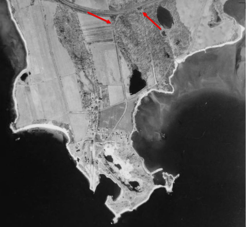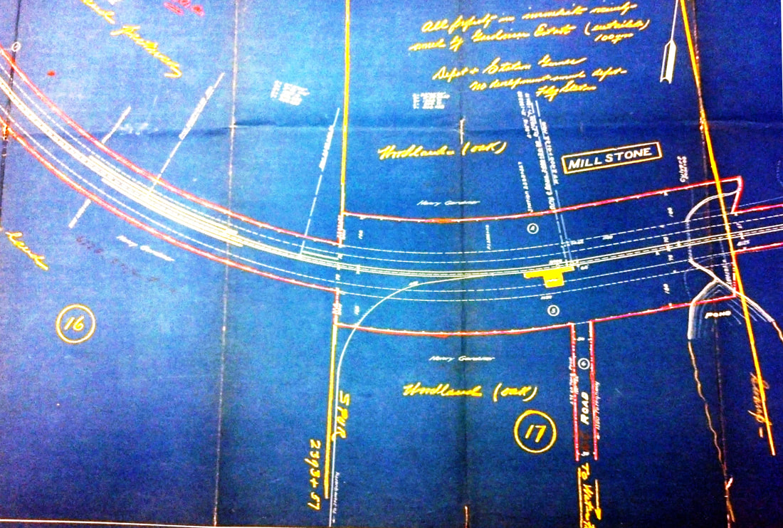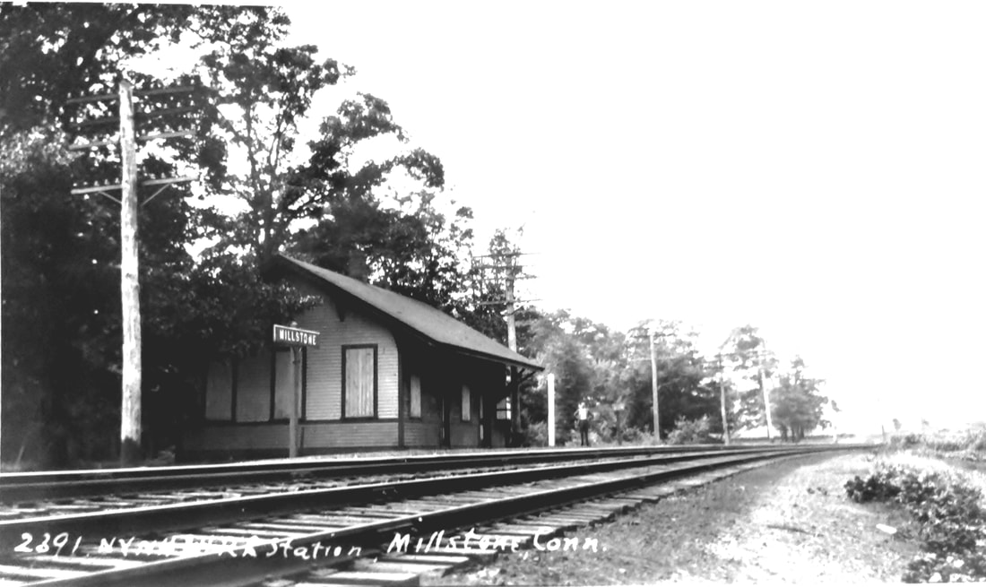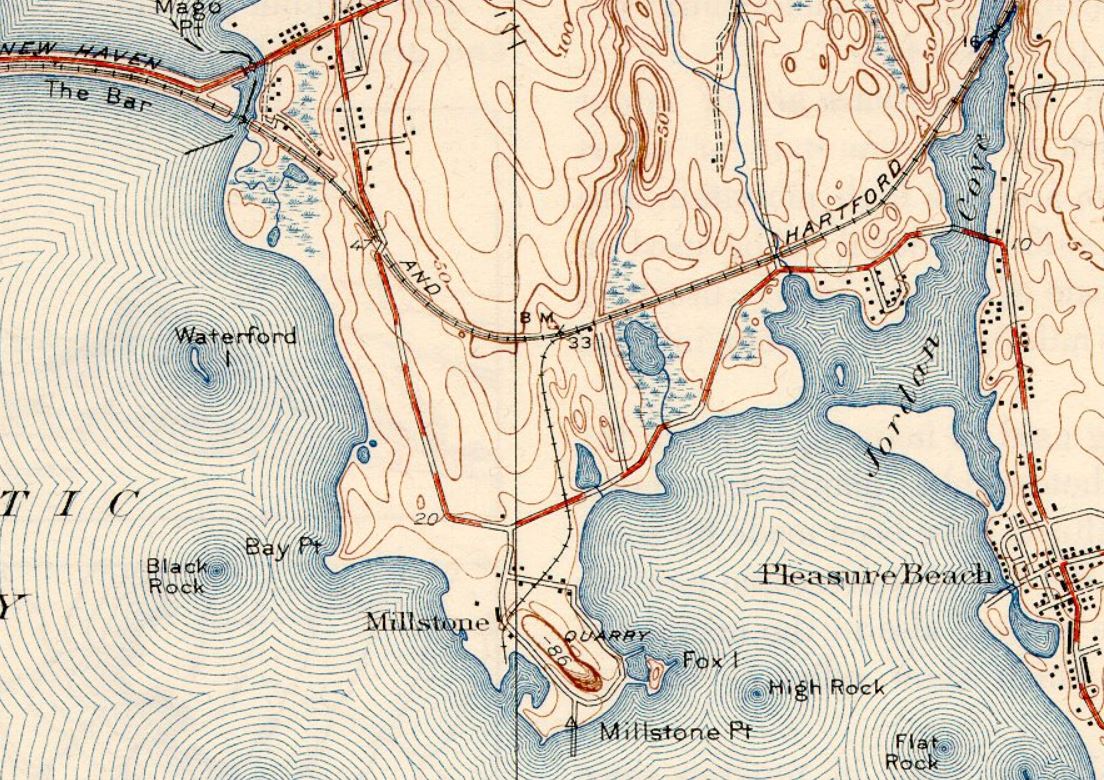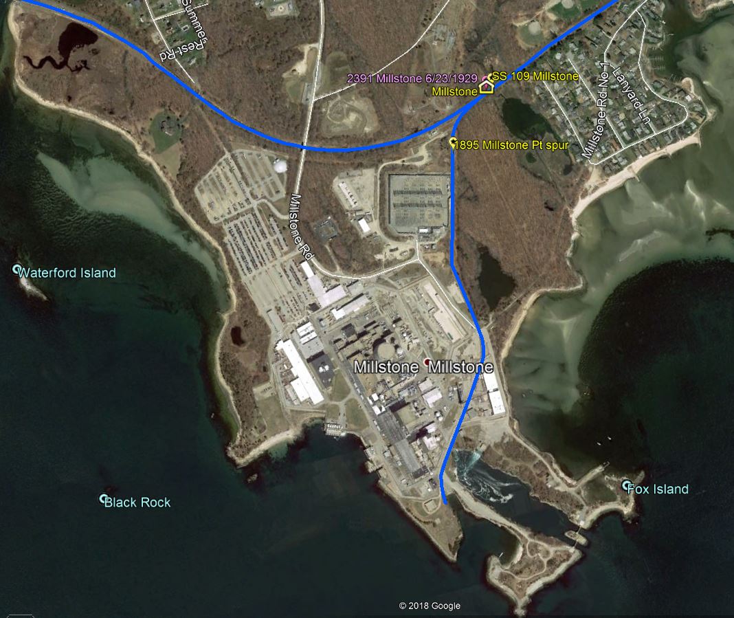 The first we hear of plans for this station in the town of Waterford is in 1894 in a Niantic newspaper called the Connecticut Eastern News. An article on 10/9/1894 said that surveying had begun through an area known as Gardiner's Woods and that "this station will accommodate passengers from Millstone and Pleasure Beach and will undoubtedly be a great convenience..." A Journal Courier article puts the opening date as 1/1/1895, saying "the station at Millstone is a new but small structure that was opened by the railroad company on the first of January." The opening date and the appointment of Samuel Rogers, Jr. as the first agent are corroborated in the News. The mention of Pleasure Beach in the first article has brought out some interesting aspects of the establishment this station as a late addition to the Shore Line. In 1904, a petition to the state railroad commissioners asked for a separate station there like other beach communities had requested. The railroad said that area service was adequate, pointing out that a Pleasure Beach station would only be 2250 feet east of MILLSTONE and that the WATERFORD station was only about 1.5 miles further east. The response to the commissioners on 5/26/1905 from Asst. Attorney Benjamin Spock (father of the famous Dr. Spock) is instructive in saying that "... the present station was established at the end of a long litigation with Mr. [Henry] Gardner..." and Spock said that the NYNH&H would formally petition to abandon MILLSTONE if the Pleasure Beach community, located on the east bank of Jordan Cove as seen in [6], could get Gardner to agree. The matter was dropped on 6/30/1905. Would Gardner have allowed the move? Interestingly, eight months after MILLSTONE opened, the newspaper was praising the Millstone Point granite-quarry owner for his innovation that changed "the manner of hauling stone from the quarry to the Consolidated railroad track. A new and good-sized locomotive has been added to the plant and switches laid..." The article goes on to say that lines of track will probably be soon reaching all parts of the quarry and that he [Gardner] is following the example of operations at Portland and Cromwell in replacing oxen with the Iron Horse. The CEN of 9/18/1894 says "... the first cars were run over the road early last week." The spur, of course, branched off right at the MILLSTONE station where a block tower, SS-109, would be established to, among other regular duties, control access to the quarry track. One might well speculate that a depot at MILLSTONE only came about through Gardner and that the "extended litigation" resulted in its being where he wanted it: positioned to serve his business. The image at [1], the earliest we have of this station, was taken on 12/27/1905. The real estate map at [2] shows the depot situated south of the tracks and the 'flag station' note in yellow would indicate diminished service in the early 1920s. Gardner's name is seen on a number of land parcels; the spur curving south at middle goes to the quarries. The 9/8/1916 val photo at [3] looks east. The image at [4] is Lewis H. Benton #2391 taken in late June 1929; the well-composed photo looks west and captures the sweeping curve of the track. Fellow photographer Irving Drake is on the platform by what looks like the flag-stop signal used in the later days. The quarry spur would be behind him; no SS-109 is seen there where you might expect it (and we have yet to see it in a photo anywhere). The last appearance of MILLSTONE in the timetables we have is 1923 and the listing is gone by 1928 so the boarded windows in the 1929 Benton shot likely indicate permanent closing. The depot seems to be in place at the right arrow on the 1934 aerial at [5], the left arrow indicating the spur. The SSRR list of 1938 does not show any structures to be retired here so the building must have been sold and removed before that time. The quarry spur, clearly shown on the 1938 topographic map at [6], outlived the closing of the quarry operation in 1963 and the 1970 opening of the Millstone nuclear power plant which is there now. Track still in the ground today is semi-active, according to author and TCS successor John Roy; Jersey barriers are removed as needed to bring trains off the NEC. The spur to Millstone Point is seen on the GE map at [7]; the old quarry itself is filled with water today. [REFS: CEN/10/09/1894/03; CEN 10/23/1894/03; CEN/11/20/1894/03; CEN/01/08/1895/03; NHJC/01/18/1895/02; CEN/08/13/1895/03; rev7/1/1896TT: yes; CSLIB RG 041:001 3.53.6 (1904-1905); NBU/03/15/1919/01: temporary depot shutdown; rev12/2/1923TT: yes; 11/18/1928TT: no; HC/12/19/1970/12][rev120818,