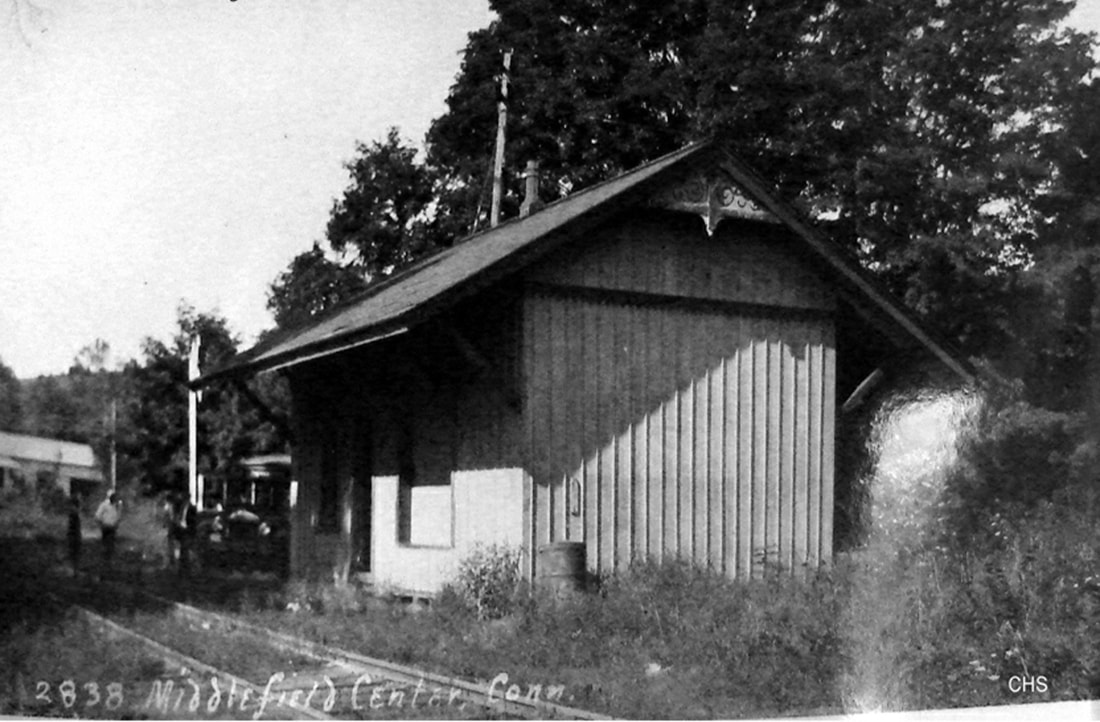 This stop was not established until 1873. Dissatisfaction with the MIDDLEFIELD station, which was to the south and "in the swamp," caused the townspeople to hold off endorsing $30,000 worth of the second mortgage bonds that the NHM&W needed to finance the 1873 extension to Willimantic. The acquiescence of the railroad in building the center depot resulted in the needed endorsement. This sum was in addition to the $40,000 worth of stock the town had subscribed to. The $70,000 reportedly represented 7.5% of the town's total grand list of taxable properties. The newspaper said that work on the MIDDLEFIELD CENTER depot was "rapidly progressing" in September of 1873, with the expectation of a fine-looking building that would be a convenience for travelers and an improvement "to the appearance of that locality." The val photo at [1] is dated 9/17/1916. The PUC photos at [2] and [3] are dated 9/24/1924 and 10/22/1925(?) respectively, looking north and east at the depot. The image at [4] is Lewis H. Benton's #2838 taken in a westerly direction in September, 1930. The exact provenance of the shot at [5] is lost to us but seems to reflect bus service after passenger trains were discontinued in 1936 or 1937 according to Karr. The 1893 map at [6] shows MIDDLEFIELD at the red arrow, MIDDLEFIELD CENTER at the blue arrow and ROCKFALL, the next station on the line, at the green arrow. It should be noted, for all the controversy caused, that the distance between the first two stations was a mere mile and ROCKFALL was only a mile and a half from the MIDDLEFIELD CENTER depot. According to the SSRR, the only remaining structure at this site was a cattle pen which was razed on 4/3/1938. The depot presumably had been razed prior to that and after the photo at [6]. [REFS: MDC/07/16/1873/02; MDC/07/31/1873/02; MDC/09/09/1873/02; MDC/09/10/1873/02; 1938 Status of Structures To Be Retired and Removed; K90][rev050417, 041120]