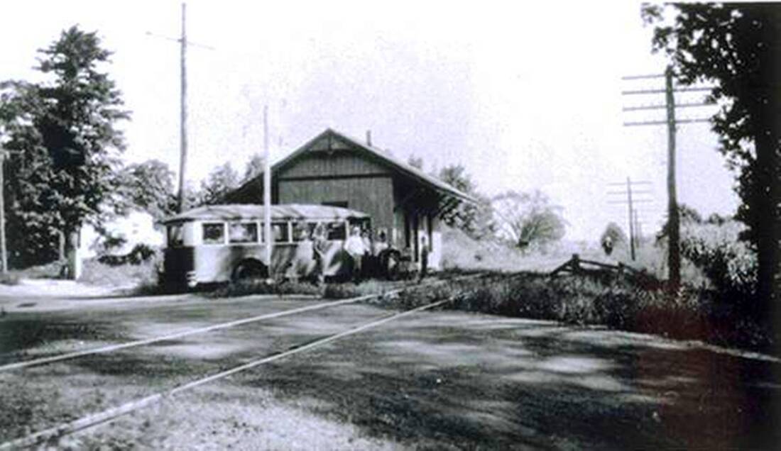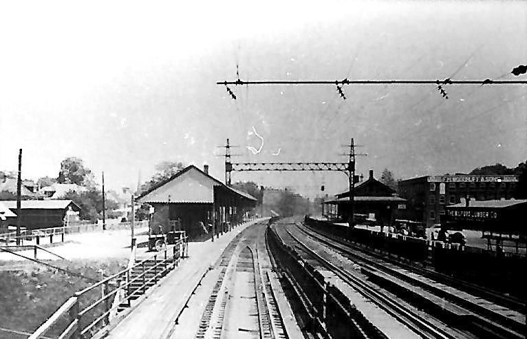 The newspaper reported in 1881 that the relocation of the tracks, anywhere from 500 feet to one mile west of the original alignment along the turnpike [Whitney Ave., Rte. 10], was finished along a six-mile stretch northward from "the Plains to Ives' station." It actually went farther north to rejoin the original alignment just below West Woods Rd. The work cost the railroad $100,000, with the town chipping in $14,000. A new station, MOUNT CARMEL4, was built along the relocated line. We have not found an exact date but assume it was completed early in 1882. This brick depot is cross-gabled in Victorian rather than slightly earlier Canal line Italianate style; for a carbon copy, see FARMINGTON2. The strcuture stands on the rail trail just north of where it crosses at Sherman Ave. Heavily modified, it is presently in commercial use. The handsome brick freight station, also well preserved and looking as it originally did, survives as a restaurant in 2021. Address is 0 Depot Ave! Lewis H. Benton's #2832, taken in September, 1930, is a good north-looking shot of the depot and the freight house behind it; fellow photographer who transported the duo on their treks is walking the rail opposite the signal mast. The 1912 real estate map at [2] shows the layout at that time. Note the streetcar tracks and trolley station on Whitney Ave., and the path of the Farmington Canal where the original railroad ran. We have to recheck if the photo at [3] carries any date but it shows the nattily dressed staff posing in front of the station, perhaps in the 1930s. Thanks to our friends at the Hamden Historical Society for use of retired railroader Amos Hewitt's photo at [4]. It shows NH #3013 arriving here on the 10/19/1947 fall foliage excursion that ran to Holyoke. Seen in the distance is the old Railroad Ave. bridge over the tracks, now long gone. See image [2], upper left corner. The streetside shot at [5] has similar passenger cars and may be the same fan trip. The 1938 SSRR list says this station was being retained for railroad use; we do not know when it passed out of railroad hands. The Track 11 Google Earth map snippet at [6] shows the area today, the original Canal line (which follwed the canal shown in blue) and the relocated right of way which is the rail trail today. [REFS: NHER/10/20/1881/04][rev010318, 051422]