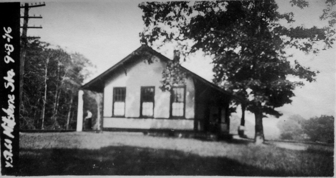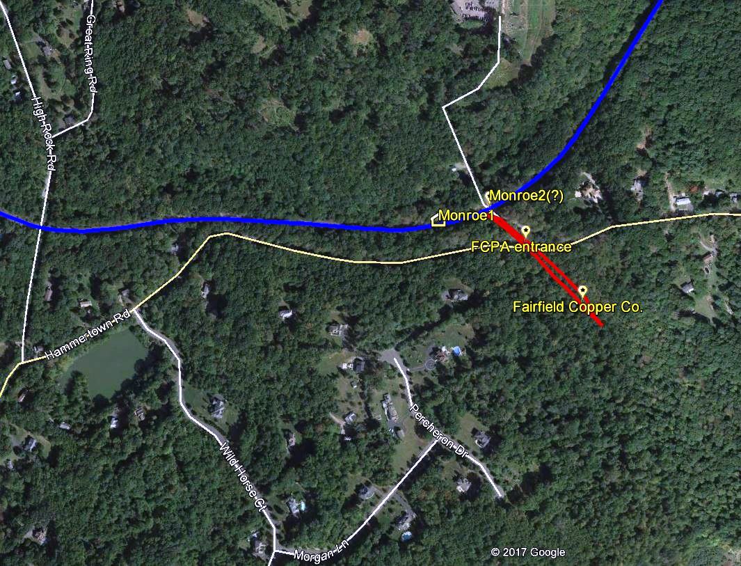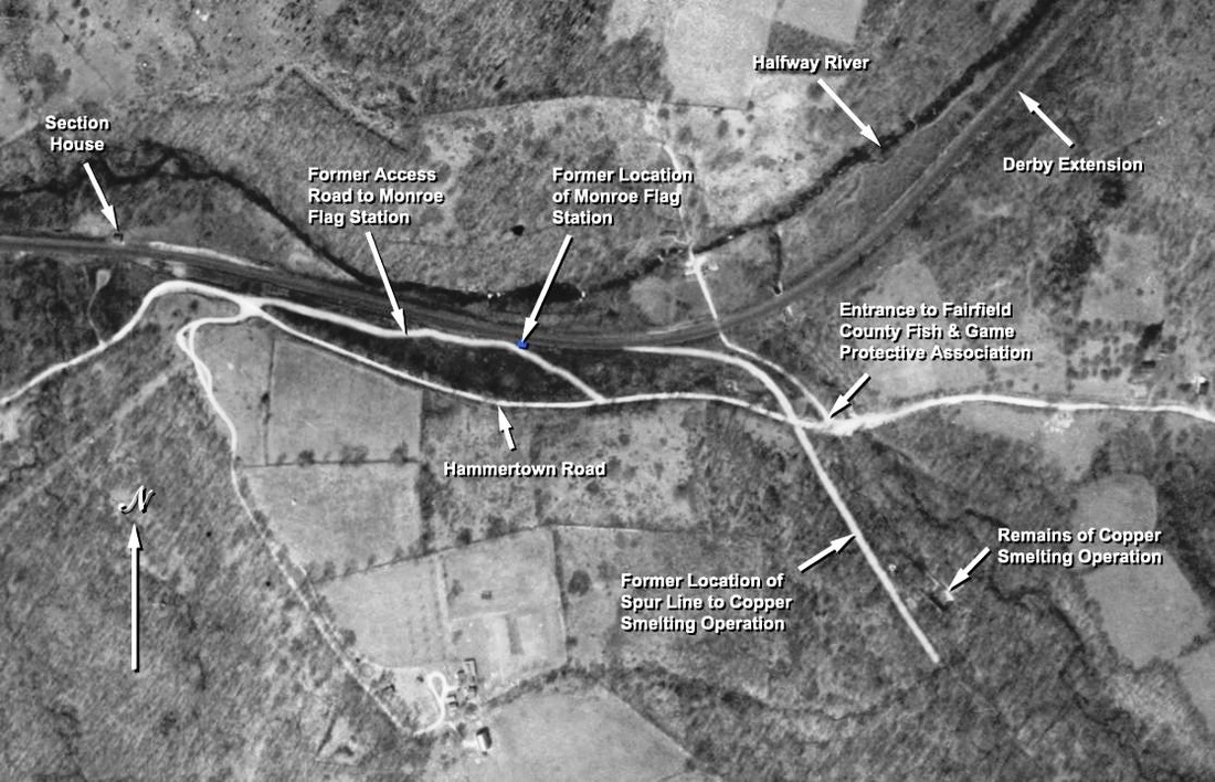 On 11/10/1889, fully a year after the line was opened to Botsford, the Newtown Bee said that "Monroe people have long wished for a station on the Derby extension, one nearer than STEVENSON... and... "a station will be built. It will be a small but pretty and suitable building, costing $200 to $300." There apparently were no plans for another stop in this town until it came about as a trade-off for a settlement of highway issues satisfactory to the NH&D. A few days later, a Register article ran on 11/20, saying that this was the day the location was to be decided upon at a meeting between Pres. Stevenson, Supt. Hopson, and the Monroe selectmen. Hammertown Rd. may have been chosen based on an ongoing revival of its old manufacturing days with Ansonia businessman Edward L. Smith's purchase of the old Minott Booth homestead. Likely due to Smith's influence and perhaps built by him and given to the railroad, the diminutive depot was put up sometime before 8/1/1890 when the Bee reported that there were complaints to the selectmen that "... our station on the Derby line has not been open regularly..." and, next week that "... it was "now open to the public." Freight shipments of apples, cattle, and lumber originating here are reported in the newspaper as are several mentions of incoming carloads of coal on the siding. Human cargo, boarders and workers, were said to be conveyed daily from here by a local hackman in June, 1894. Early mentions of a spur to the Smith's land notwithstanding, the railroad commissioners approved two parallel tracks "a short distance apart" in 1894 to reach across the road to Smith's latest venture, the Fairfield Copper Co. A smelting operation replete with 92-ft smokestack and a switchback to cut car charges, it was reportedly shipping out a carload of product a day for a short time. The entrepreneurial hero of the hour, for whom the Monroe stop was almost named Smithville, however, soon faltered and bankruptcy proceedings ensued by 1896. A second station, MONROE2, was built and removed to become STEVENSON2 in 1905. Upon its removal, the Bee said that "the old Monroe station now in use, it is said, is to be renovated and improved," and on 1/18/1907, that it had "been given a new coat of paint and presents a much neater appearance." MONROE1 is seen in the 8/17/1916 val photo at [1]. Kevin Daly's arrows on the 1934 aerial map at [2] clarify the precise location of the station, the spur and the factory site after a permitted recon mission with Bill Bracco a few years back. The snippet at [3] from our Track 11 Google Earth map shows the area today; the Fairfield County Protective Association, a gun club, owns the land adjacent to the station site. The ultimate fate of MONROE1 is unknown; it was likely disposed of before the 1938 SSRR list on which it does not appear. [REFS: NBE/11/01/1889/04; NBE/11/15/1889/02; NHER/11/20/1889/02; NBE/08/01/1890/03; NBE/08/08/1890/03; HRRAR 1890, p5; NHER/01/22/1894/04; BH/03/28/1894/02; RRC19.216 (6/21/1894); CRC42.1894.34; NBE/01/25/1895/03: accident at crossing; NBE/02/15/1895/06; NBE/11/08/1895/07; NBE/10/06/1905/07; NBE/01/18/1907/10; NBE/12/06/1907/10; Edward N. Coffey, A Glimpse of Old Monroe, p58+][rev010418]