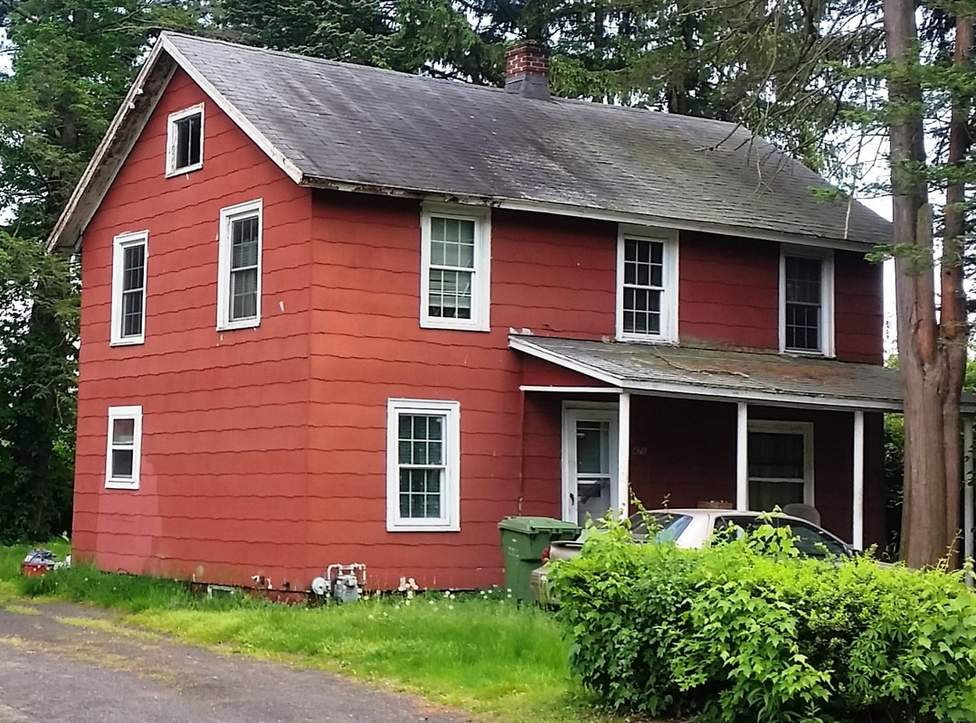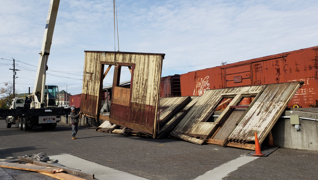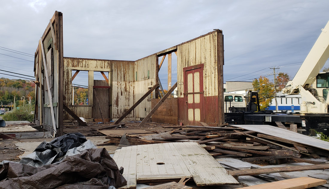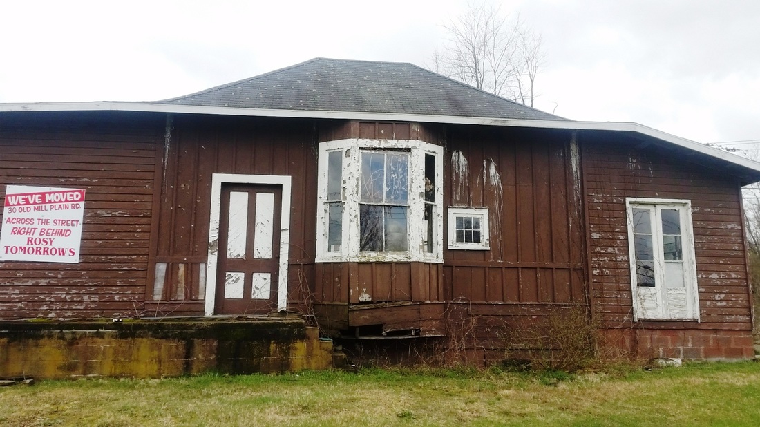 This station in the western part of DANBURY was up in 1881 for the opening of the NY&NE extension to the Hudson River and was described by one reporter as "a pretty depot building." If it is another of Leman Oatman's stations, it looks virtually identical to NEWTOWN/N and similar in size and design to TOWANTIC. IN 1918 it became part of the CNE with a divisional shake-up that moved that railroad's headquarters to Danbury. MILL PLAIN stood in railroad use until passenger service on this line ended ca. 1928. In 1930 it was purchased by Jeremiah J. Coffey, the Danbury dog warden, and moved to the corner of Rte. 6 and Ridgebury Rd. to be his residence. Later moved slightly east, it became the Best Round Golf Car Repair shop until a few years ago. The new property owner then donated the vintage structure to the Danbury Railway Museum. Prior to moving it on 10/26/2018, the wings added by later owners were shorn off and the hipped roof was removed for tranport; ironically and thankfully the addition of the wings protected the walls of the original building which were left intact inside! DRM intends to reassemble the depot and use it as a yard-destination attraction. Many thanks go to well-known rail photographer Dan Gallo for his tireless efforts which finally came to fruition two years after the planning began. Thanks also to Stan Madyda and DRM for their vision and determination to see this project through and save this attractive, historic little depot from the wrecker's ball. The val photo at [1] is dated 9/5/1916. Lewis H. Benton's shot #2139 at [2] dates to late June, 1928 and shows the freight house behind the passenger station. That freight building may also date to 1881 when the Bristol Weekly Press said work on the new station there had slowed and carpenters were coming here. Our photos at [3] and [4] were taken on 4/2/2016. The move shots were taken live on-site at Mill Plain [5] and DRM [6] on 10/26/2018. The image at [7] is the from the 1886-1889 NY&NE real estate atlas and shows the layout of the station grounds at that time. [REFS: DN/07/27/1881/01; BWP/11/17/1881/02; DEN/05/23/1930/08; K84; R66: John Roy's ca. 1885 date and HP&F origins for this station are in error.][rev112818, 112420]