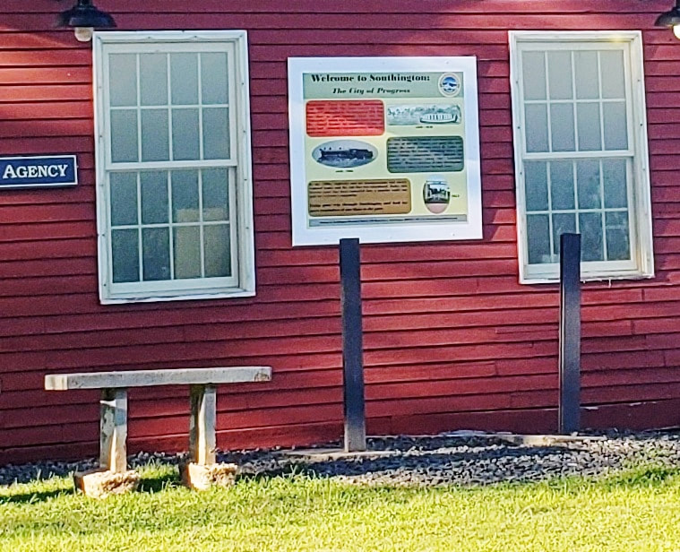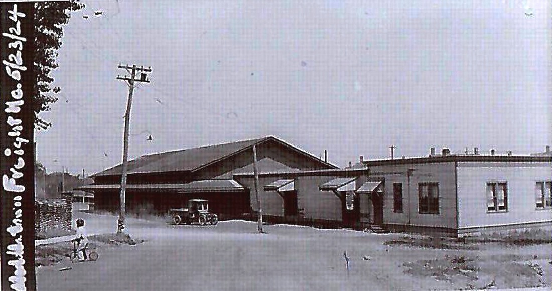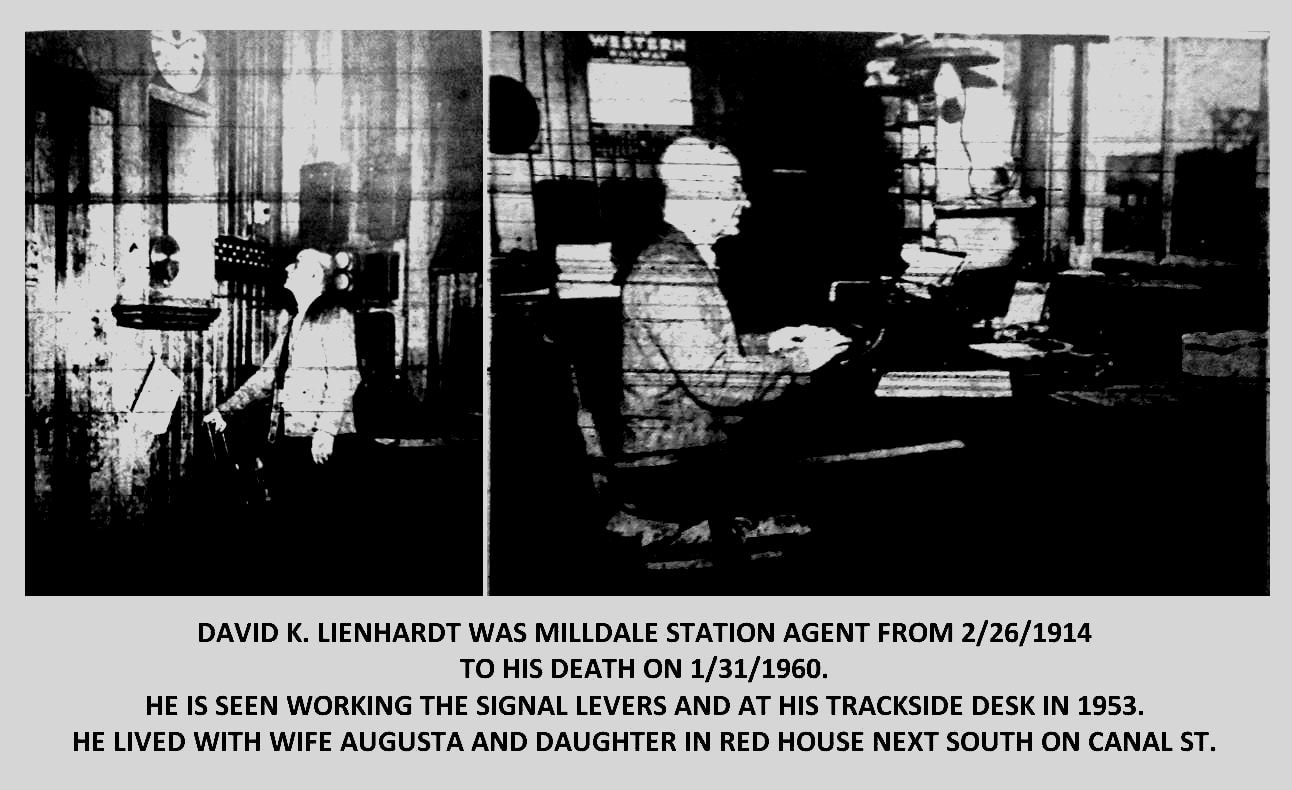 According to the 1911 NYNH&H real estate card, this depot was constructed in 1894 but new research has proved that wrong. A May, 1892 article in the Southington Weekly Phoenix reads "The new depot is a great improvement over the old one and our pretty village gets the benefit of it in the increased respect of travellers who laughed at the old structure. First impressions count for a good deal, and a neat depot is a first-class advertisement for any town or village." Our thinking is that the depot was newly opened just about that time or perhaps even late in 1891. The 1909-postmarked card at [1] is perhaps the earliest view we have and it is full of historical detail: wooden order board, ladder steps up to freight platform, old baggage wagon and pushcart, bicycle, uniformed station agent with cap, loiterers with Chico Marx-hatted fellow on the left. Just fabuous, wish we could see inside! The ICC val photo at [2] is dated 9/25/1916; already the signal mast that still stands today has replaced the roof-top order board. Both these views show three windows, a double-doored entryway at the foot of the freight-platform steps, the platform and the freight door. No agent's bay is seen in this rather uniquely configured building, only seen elsewhere we think in Carolina R.I. The new station was located about a a few hundred feet north of the old one, but now west side of the track on the site of the old Famington Canal lock #9. The new facility undoubtedly pleased the Clark Bros. Bolt Co., which was adjacent to the new depot but had its own siding seen on the 1915 val map seen at [4]. The plant was reportedly consuming 100 tons of iron monthly in its production of metal products shipped all over the continent. MILLDALE2 was heavily damaged by a fire that long-time (1913-1960) agent David Lienhardt saw at 7:30 a.m. on 2/4/1928 from his house which was just south of the depot. The stove in the passenger waiting room had exploded. The PUC image at [3] was taken on 2/6/1928 right after the fire, perhaps for insurance purposes. Lienhardt conducted business for the next four months from space at Clark Bros. According to him, they "were able to save all of the building except the passenger station." Since passenger service on the Canal line had ceased on 12/31/1925 and the waiting room was no longer needed, the railroad did not miss the opportunity to reduce the size of the building and pay less taxes in the process. In a timely coincidence, peripatetic depot photographer Lewis H. Benton visited in 1928, probably on 6/22, just after the repairs were completed. His photo #2133 is seen at [5] and shows the entrance relocated to the south end of the depot. Our red arrow on the 1914 tracing at [7] faintly shows the south wall erased at left [upper arrow] as well as the hacked roof [lower arrow] as the old plan was tweaked after the fire. Note also the ornate end bracket work that was not restored in the rebuild. Penn Central Bulletin Order 1-S30 dated 12/26/1969 announced the closing of MILLDALE2, a part-time agency station since Lienhardt's death in 1960. This portion of the Canal line was opened in 2011 as a link in the Farmington Canal Heritage Greenway [click here]. The station was sold in 1977 and was in private hands, even apparently being used as a residence for a time. In 2010 it was purchased by the town of Southington and opened as a museum in 2013, as seen at [6]. [REFS: SWP/05/20/1891/02; NHER/10/20/1897/11; NHER/11/21/1899/10; NHER/06/30/1900/08; CWN/07/05/1900/02; HC/02/05/1928/5A; SNE/02/09/1928/01; WR/03/15/1953/M3; R66: incorrect in saying north end was removed][rev101617, 062322]