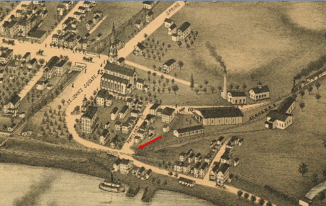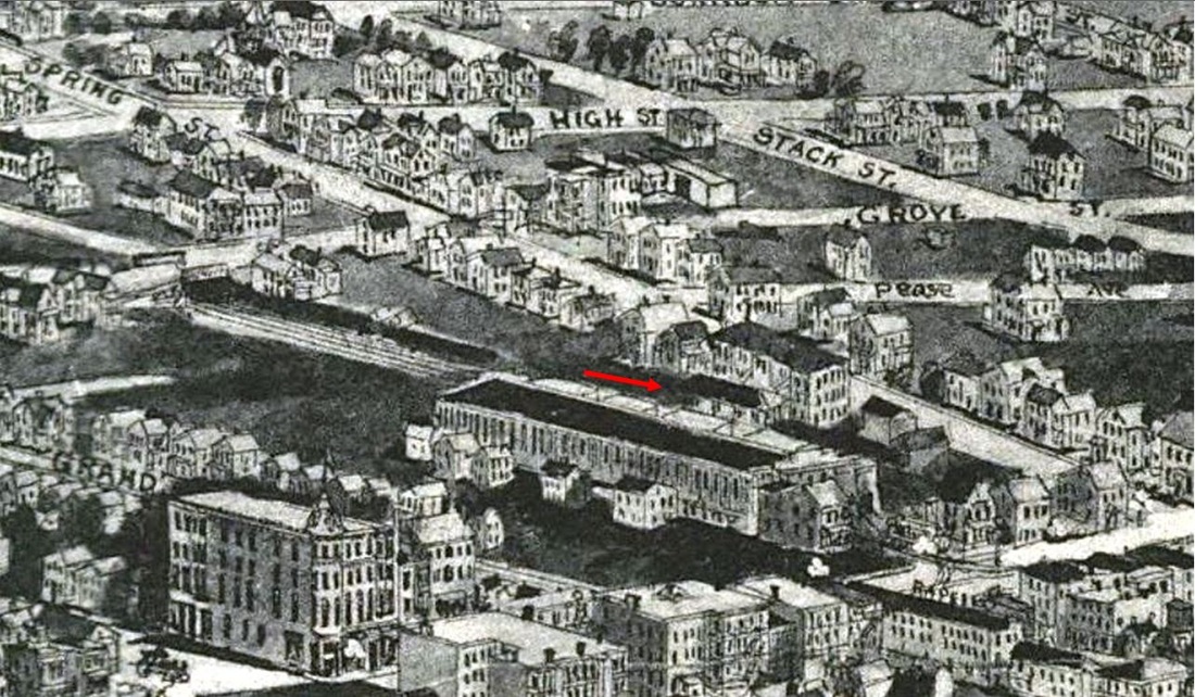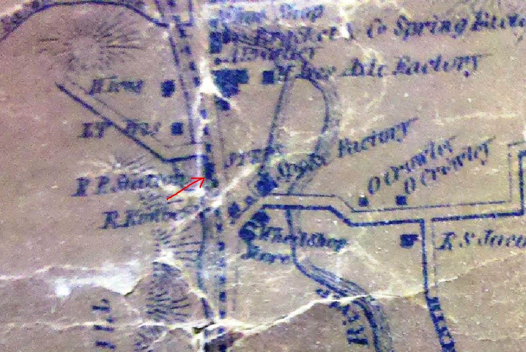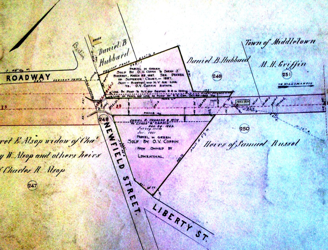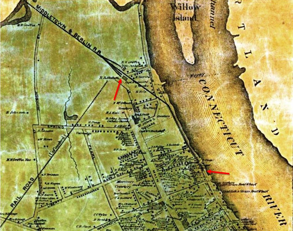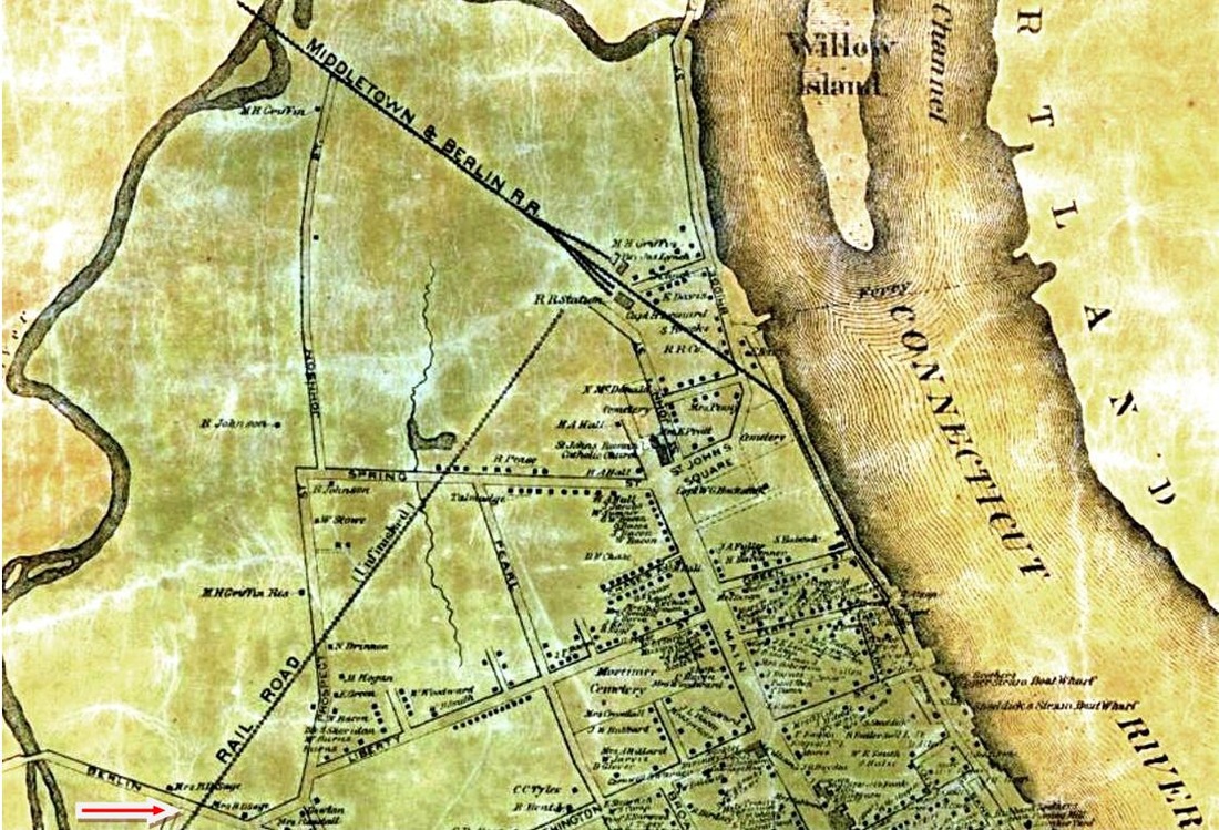 The newspaper said in early August, 1870 that "the Air Line Road was opened for regular trains on Monday of this week [the 1st]... A temporary depot has been erected at Berlin street, which will be used until the road is finished to Spring St." A Register article sheds more light when it says that "the Middletown depot 52x26 feet, is being built for a temporary depot and will be used as a car house, after the regular depot is built." Tickets were sold here for the first time on 8/5/1870. The red arrow in the lower left corner of the 1859MC map at left points to the location of the depot, which would be used until December. The 1886 real estate map at right shows parcels owned by the railroad on what was then labeled Newfield St. First proposed in the 1840s as the New York and Boston RR, the New Haven, Middletown & Willimantic would not open between the first two points until 1870. It was popularly known from the beginning as the Air Line for the directness of its route. We have no photo of this depot. [REFS: MC/08/03/1870/02; CR/05/13/1870/02][rev021315]