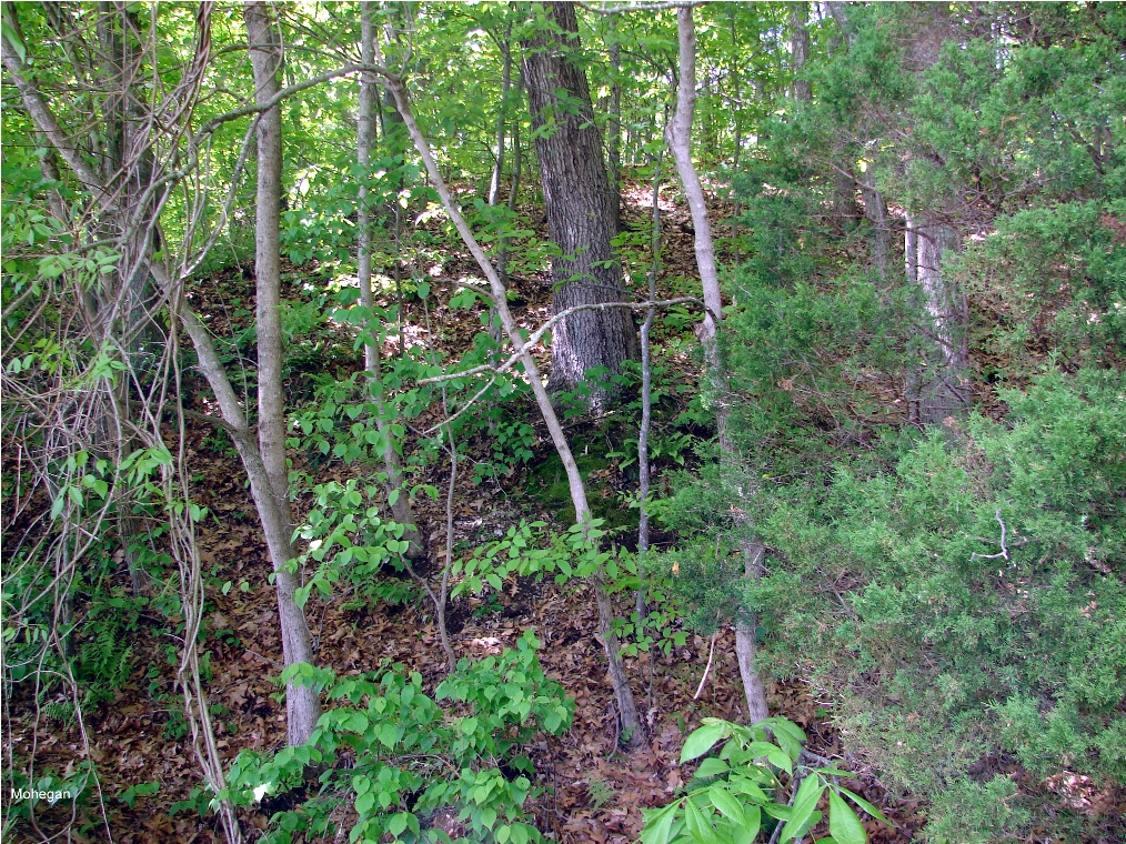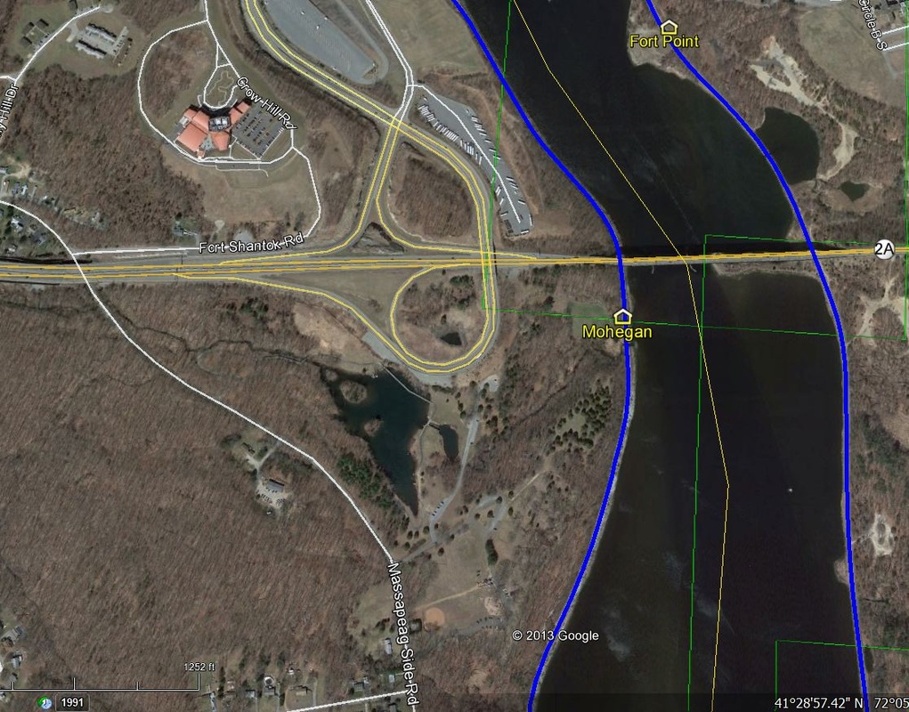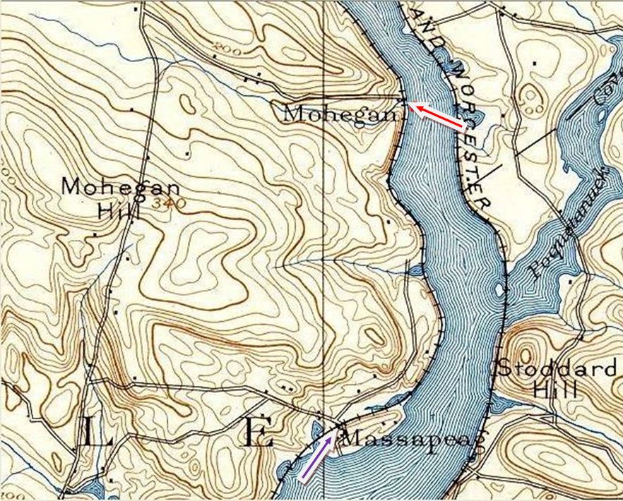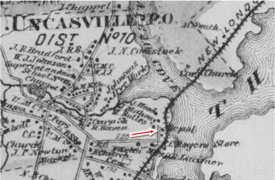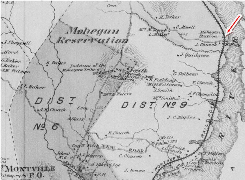 This station in the town of MONTVILLE was established by the NLW&P when it opened in 1849. Image [1] is thought to be the covered platform that served the flag station here, in later days at least, and the mound corresponds to the terrain today, as seen through the foliage in photo [5]. An arrow points to the station site on the 1868 map [2] and the 1893 topo map [3] shows the MOHEGAN stop as well as MASSAPEAG, two miles south. The 1883 NLN map [4] shows Shiantic Brook running just south of the stop and the scene of a derailment in 1877, plus the platform and some scattered buildings. The icon on the Track 11 snippet [6] marks the location today, in the shadow of the Mohegan Sun casino. The 1917 val map [7] shows the words 'Flag Signal' above the symbol that our red arrow points to. [REFS: CR/07/11/1859/02; NA/09/01/1869/03; HDC/08/27/1877/03][rev012014]