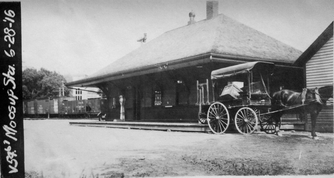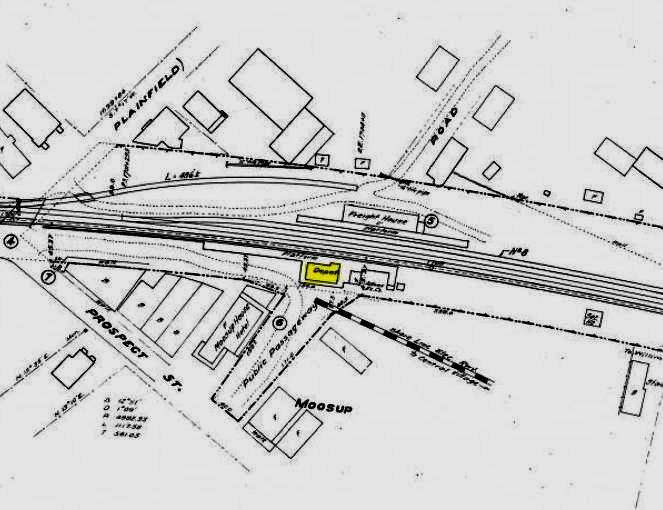 This station was built in 1898 by what had become the New England RR after the NYNH&H got control of the NY&NE in 1895 and reorganized it as a subsidiary. The railroad commissioners said in December, 1897 that a new depot was being built here but we have found no actual opening date in the newspapers. The 1915 val map at lower left shows the location of MOOSUP3, west of the tracks and below Prospect St. like its two predecessors, indicating no move farther north toward Main St. as had been rumored. This station is on the 1938 SSRR list as being retired and subject to sale and removal in that year. [REFS: HC/03/15/1897/09; NHER/03/15/1897/07; CRC45.1897.23][rev010318]