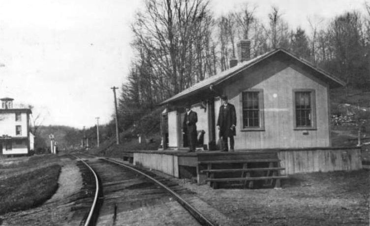 The item on the left is a card postmarked 5/2/1910 and it shows the residence where the first depot was reportedly located. In the photo on the right, we can see this building as well as the station that came in 1886. An August, 1873 newspaper report that the Shepaug RR was building a station at Smoke Hollow in West Morris is either incorrect or this residence was followed by a depot for which we have no other verification. That possibility needs to be researched further. [REFS: HDC/08/08/1873/04, HDC/8/15/1873/04][rev032313]