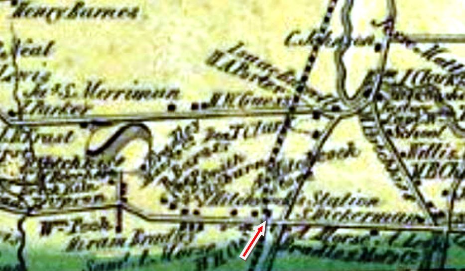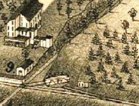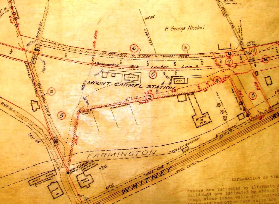 Also referred to as AXLE WORKS or AXLE SHOP, this was the first early stop in northern Hamden and appears on a 3/25/1849 timetable at a point nine miles above New Haven. The photo at upper left shows the track in front of the factory with probably a remnant of the old canal alongside of it. Corroborating Hartley's History of Hamden [p328], the station is seen as just a platform at the red arrow on the 1856NH map at [2]. By 1880, the track would be moved farther west to lessen the number of grade crossings and to stop frightening the horses along Cheshire Tpke. The shot at right shows no track and an enlarged factory complex, the shapes of the buildings agreeing with the footprint on the 1870 map at [4]. The canal looks to have evolved into highway. The location of the platform appears to have been at the present intersection of West Woods Rd. and Rte 10. MOUNT CARMEL1 was abandoned in 1875 along with MOUNT CARMEL2 in favor of an actual station building, MOUNT CARMEL3, built at the Ives location in 1875. [rev121013]