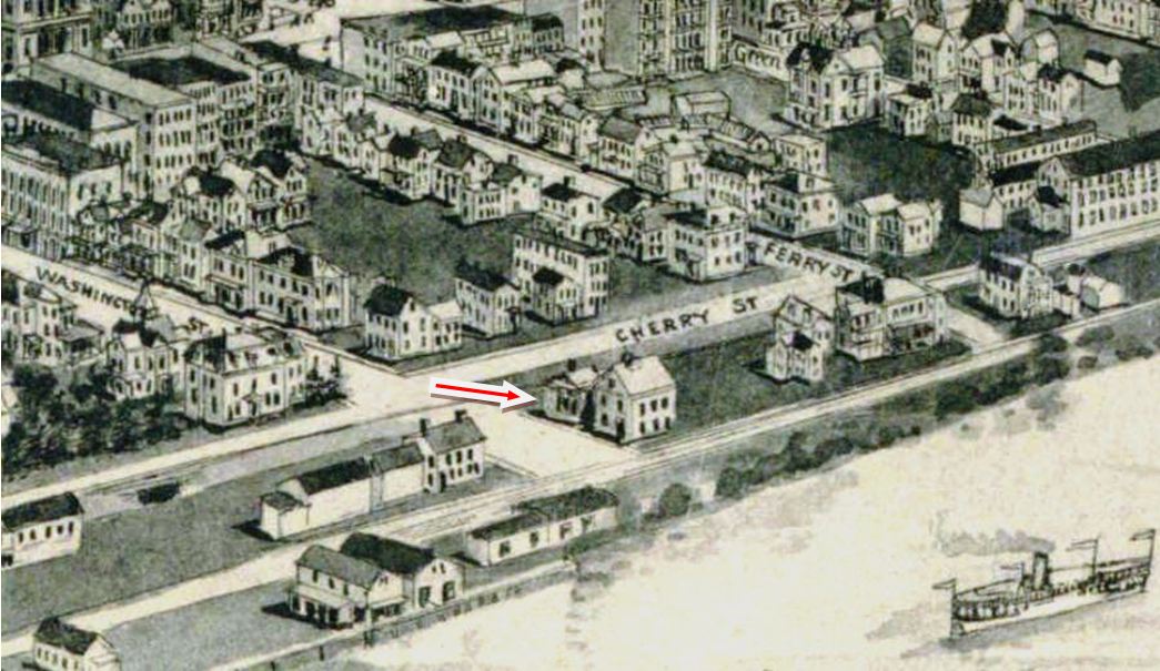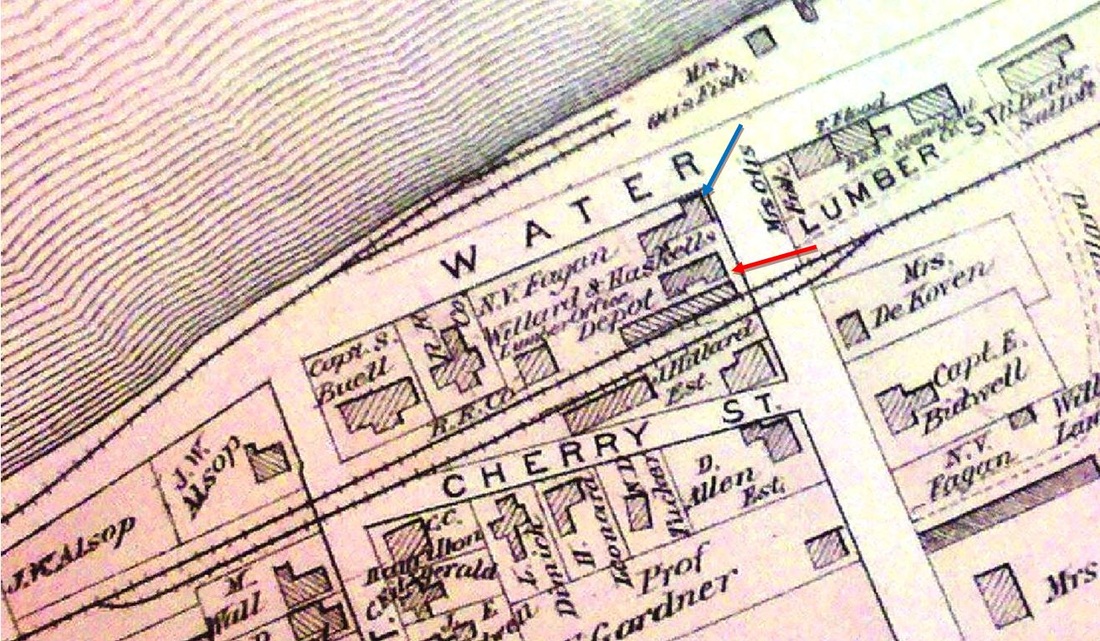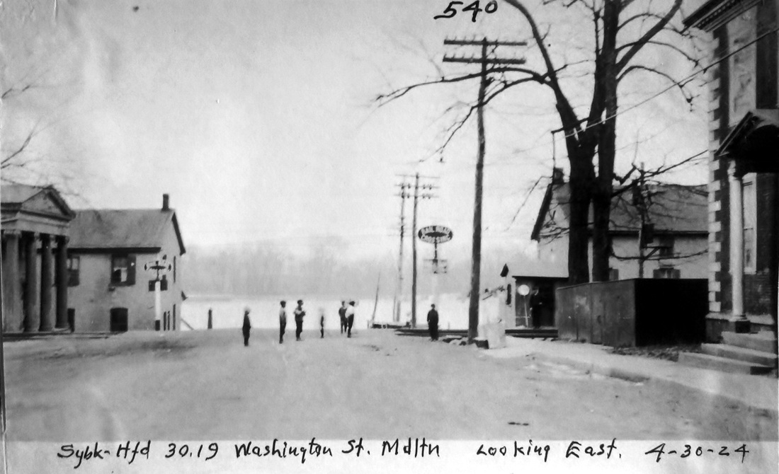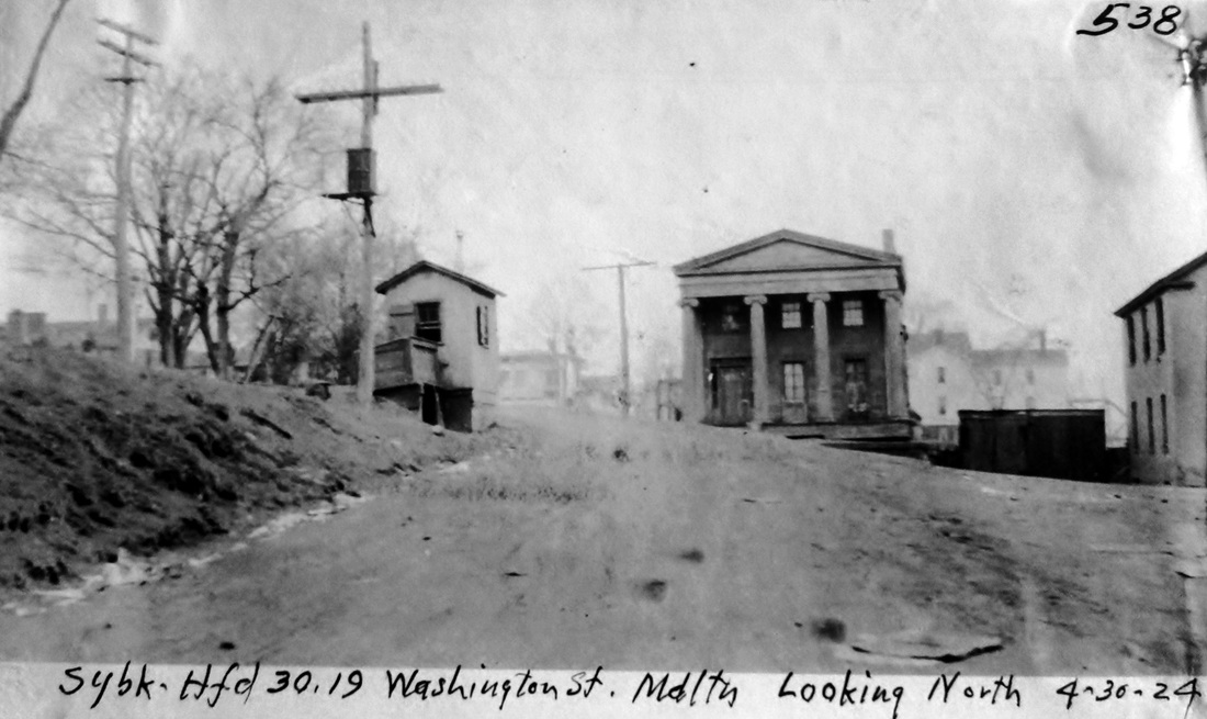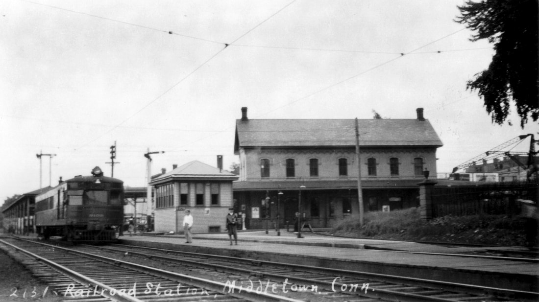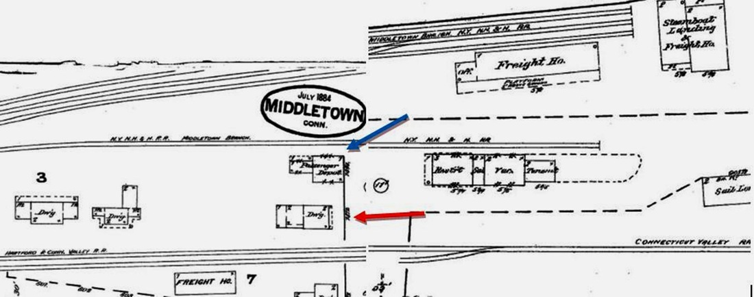 The second passenger depot on the Berlin Branch stood on Washington St. at the end of the Middletown Extension RR referenced in our previous entry. Obviously re-purposed, the building may previously have been Willard & Haskel's store. Its railroad service probably dates from 1879 to 1884. The former date is when the Courant speaks of a further extension to a new freight house at the steamboat wharf and the latter is when the hitherto-unconnected Berlin Branch was given access to MIDDLETOWN/J2 and all passenger service was handled there. An 1882 article foreshadows this when it says "that the buildings now used together with the hotel and restaurant at the foot of Washington street, will be made into dwelling houses." The 1874 Beers atlas map at [1] has trackage ending at the steamboat dock; the blue arrow points to this structure but does not yet label it as a depot and the red arrow points to the CV station in our next entry. The 1877 Bailey map at [2] shows this structure with no track to it. The shot at [3] is a 12/11/1924 val photo. The 1884 Sanborn map at [4] shows this structure as the 'Passenger Depot' at the blue arrow, above the 1879 freight station; the former CV station at the blue arrow is labeled as a dwelling. The val photo at [5] is dated 3/13/1932. The undated photo at [6] shows both former depots. The letter at [7] shows service to Washington St. discontinued on 6/19/1925, for reasons explained in our previous entry. [REFS: NHJC/12/08/1877/02; HDC/07/16/1879/04; HDC/09/16/1879/04; HDC/09/29/ 1879/02; HDC/11/19/1879/04; NHER/12/23/1880/00; CRC27.1880.13; HDC/10/31/1881/02; HDC/11/01/1882 /02; HDC/10/31/1884/04][rev032115]