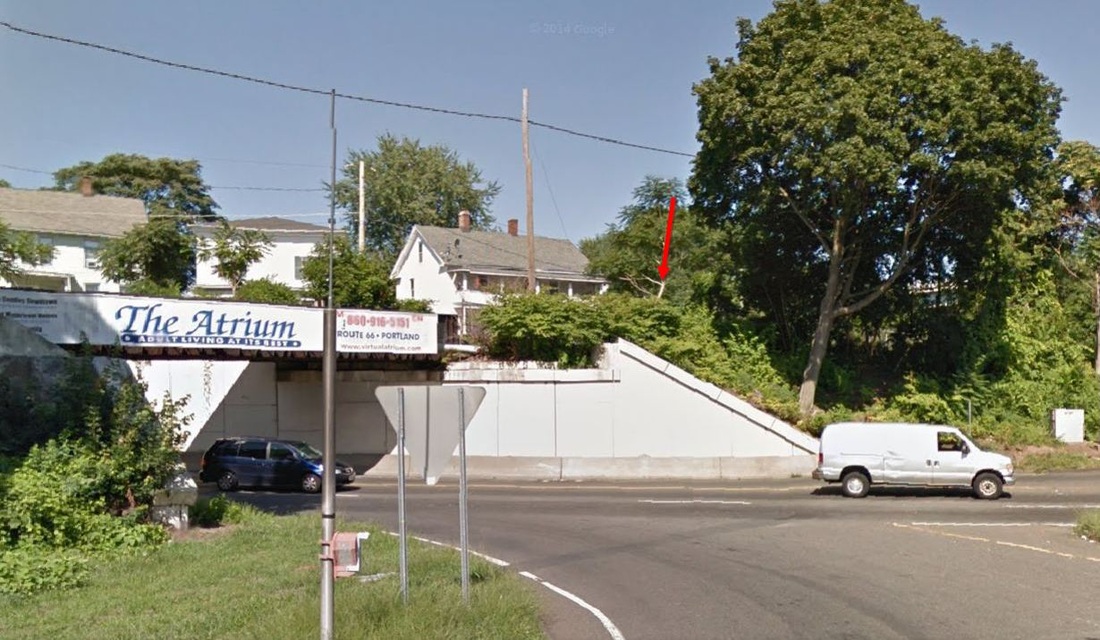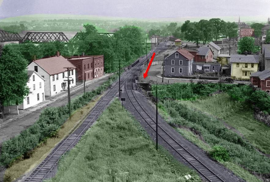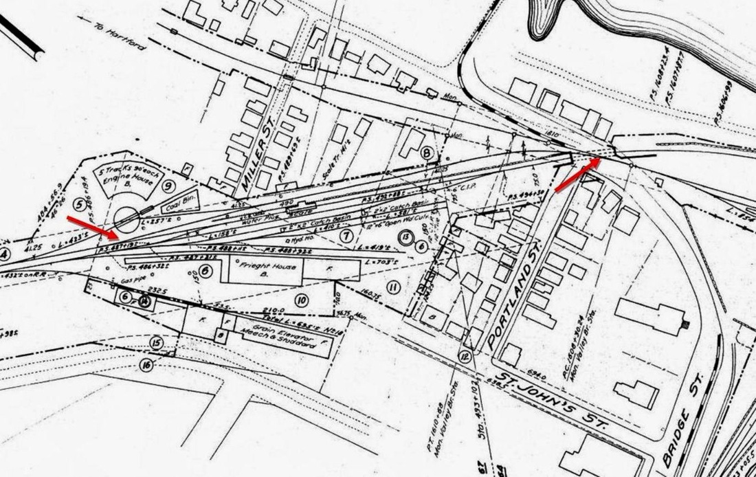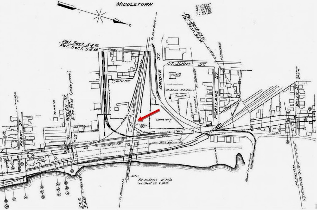 Also known as the Middletown & Berlin, the Middletown RR opened in March, 1850 from a junction with the H&NH at BERLIN to a terminus here on North Main St. The newspaper said that "this road is now in running order. The steam horse took his start from the depot with a passenger train on Friday [3/8], for the first time. The cars are, for beauty and comfort, of the first class." The MRR was built per an agreement of 7/12/1849 that it would become "part and parcel" of the H&NH and did so on 4/24/1850, according the Chronological History of the New Haven Railroad [CHNH]. The upper red arrow on the 1859MC map at [1] points to MIDDLETOWN/H1. The map also shows the Air Line in the planning stages and the H&NH's 1860 terminus at the lower arrow, a 'tidewater' point that was authorized in 1849 and even shows up on an 1851 map but was not built until a decade later. The cash-conservative H&NH was leery of any branches and apparently happy enough with its depot which was located, inconveniently for most, on the northern edge of the downtown area. The 1860 annual report unabashedly admits that this extension only came... "in pursuance of an implied understanding with the citizens of that place, that the Middletown Branch should be built to the River..." The Constitution said on 6/6/1860 that "the railroad to the river is complete. The rails are laid, and the locomotive has been run over 'the line.'" Indicator number '10' on the 1877 Bailey bird's-eye map [click here] shows this as the 'N.Y.N.H.&H. Railroad Station at [2]. The use of this depot for passengers was likely discontinued in 1879 when trains were run to Washington St. The structure was thereafter partially rented but remained as a freight station; the 8/16/1916 val photo at [3] shows the later freight depot of similar design. Our red arrows on the val map at [4] show the connection that was built in 1884 by the NYNH&H to allow branch trains to access MIDDLETOWN/J2. The photo at [5] shows the Portland trolley lead on the left, the CV main in the middle, the Berlin branch connection to Union Station at the right, and the line to Washington St. passing under Bridge St. in the ravine to the far right. In 1925 a $200G project built Hartford Ave. with an overpass for the railroad, the purpose being to close the dangerous Bridge St. grade crossing that had existed since the CV opened in 1871. A temporary wooden trestle was "pushed aside" when the steel bridge was lowered into place "secretly some morning between midnight and 4 o'clock," so as not to attract crowds of onlookers. Since the city did not want any rail across the new thoroughfare, the tunnel track had to go. With boat traffic declining, service on the Dock branch terminated on 6/19/1925 in connection with the newly built Hartford Ave., which opened on 11/22/1925. The tunnel is buried to this day. The arrow in the photo at [6] points to the north portal in the late 1940s and the image at [7] shows where the south portal once saw daylight. [REFS: MC/03/13/1850/03; HDC/05/30/1851/02; CRC1.1854.12; MC/07/16/1856/07; HDC/11/16/1859/02; MC/11/19/1859/02; HNHAR24.1859.6; MC/06/06/1860/02; NHJC/12/08/1877/02; HNHAR25.1860.6; CC/06/09/1860/02 ; MP/04/21/1925/01; MP/08/25/1925/01; MP/11/19/1925/01; K75][rev 021715]