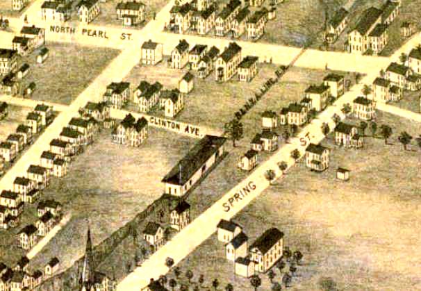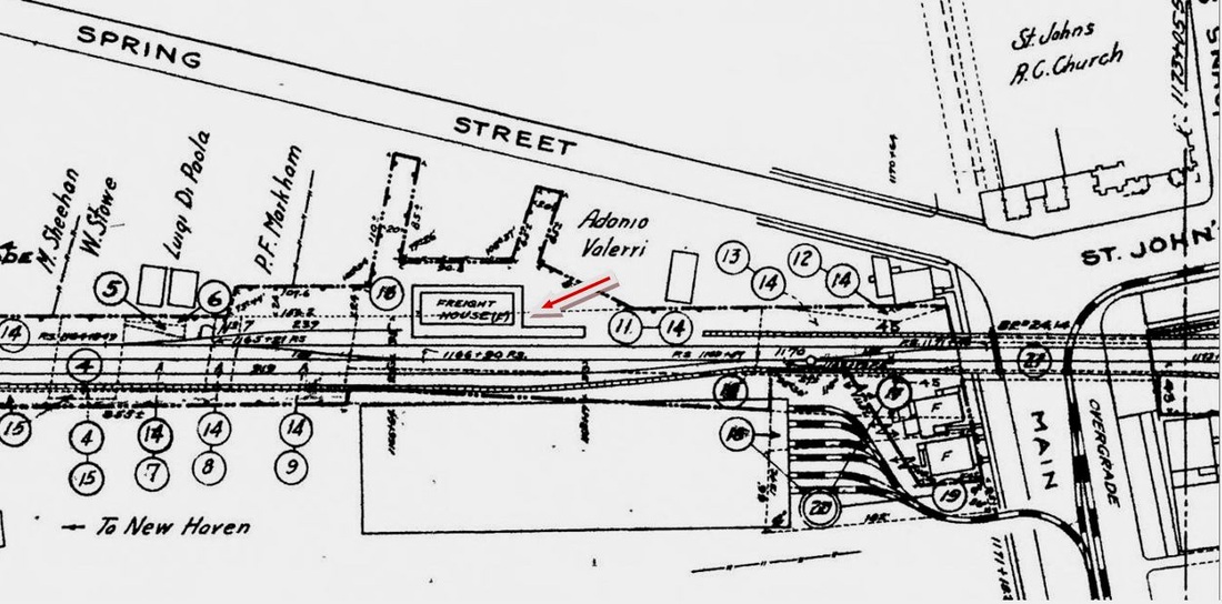 According to a December, 1870 article in the Register, "the new depot at Pearl street, over one hundred feet in length is nearly completed." This structure is presumably the one that the Courant referred to in 1875 when it said that "the old depot of the Air Line road, in Middletown, was burned yesterday. The building was used for freighting, and the freight burned with the building. This station was apparently rebuilt, as seen in the photos, but the replacement for the "old depot" was likely just for freight with passengers using MIDDLETOWN/J1 at the junction with the CV by this time. The 1877 Bailey map image at [1] correctly reflects the reorganization of the NHM&W as the B&NYAL in 1875 and shows the station at the north end of Clinton Ave. with Spring St. running east-west above it. The 8/17/1916 val photo at [2] labels the building as the old freight house and the 1915 val map at upper right shows the layout of the grounds. The image at [4] is the 1915 Bailey map. The lower photos probably date to the 1920s. [REFS: MC/08/03/1870/02; CR/12/17/1870/02; MC/07/26/1871/02; CC/08/21/1875/04][rev020615]