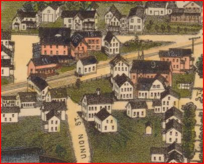 The HP&F established this stop in 1854 when they opened from Providence, RI to Willimantic through this manufacturing village in the town of PLAINFIELD. Our red arrows on the 1856WC map at left and the 1869 map at middle show the location. The first depot was built between October, 1855 and October, 1856, according to information in the annual reports. It apparently lasted until a 7/21/1892 spontaneous-combustion fire that caused $100,000 worth of damage over three acres in the heart of the community. MOOSUP1 is pictured at right on the Burleigh bird's-eye map of 1889 [click here], the building with the locator number '11' on the roof. Trains due at the time were reportedly held at each side of the burning passenger and freight stations for upwards of an hour until it was deemed safe for them to pass. [REFS: HPFAR6.1855.8; HPFAR7.1856.9; NHER/07/21/1892/01; SR/07/22/1892/07; CRC39.1893.39; CRC41.1893.39][rev070513, 121618]