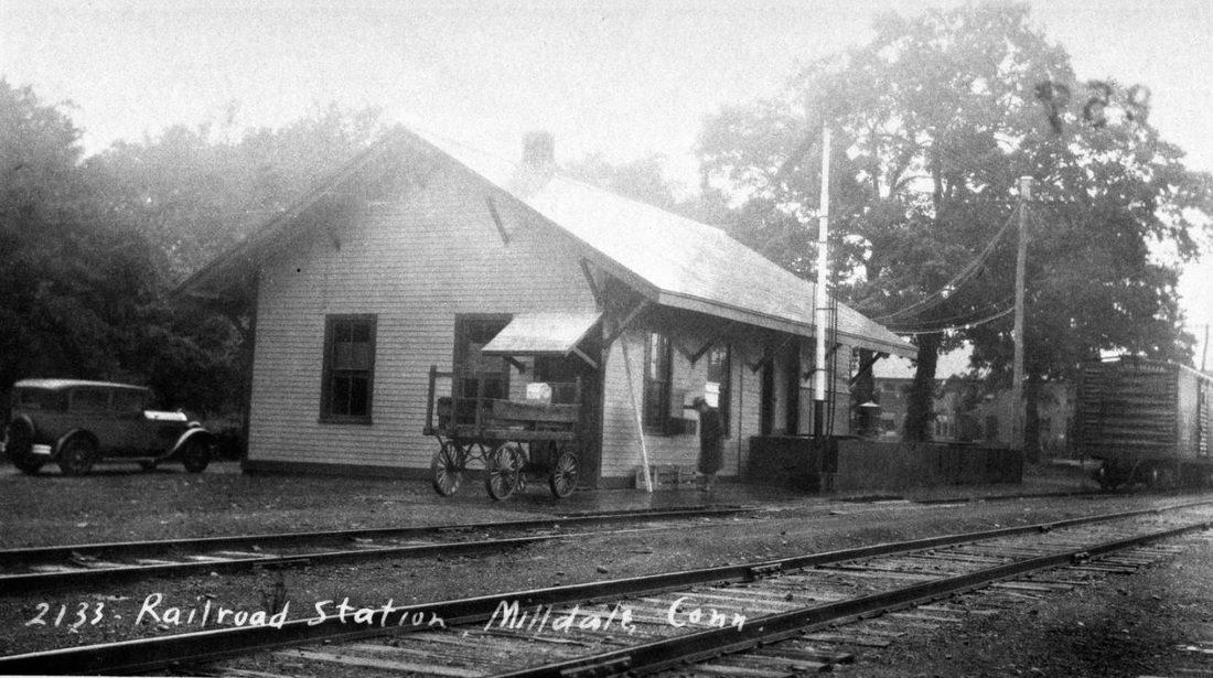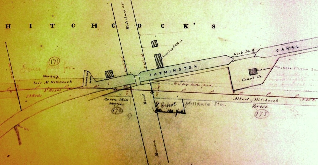 This stop was an original one on the Canal line from 1848 when it was known as HITCHCOCKS for the prominent local family which owned the land at Lock 9 on the Farmington Canal. This is where the waterway intersected with the Meriden-Waterbury Tpke, today's Rte 322. HITCHCOCKS station stood east of the track at the road, as shown by the red arrows on the 1855HC map at [1] and the 1869 Baker & Tilden map at [2]. Image [3] is from the NH&N Index Map Book that dates back to 1848 and was subsequently revised as the official NYNH&H property record for this line. Some interesting details are seen, including the route of the canal along today's Canal Street and the name Albert Hitchcock, the energetic entrepreneur who operated boats to New Haven and built 'Waterbury (aka Hitchcock's) Basin' to receive freight for the Brass City. Also seen is the newer name MILLDALE pencilled by the old station and the footprint of the 66x100-ft structure itself. We have no photo yet of the first station which may have been a purpose-built depot similar to early Canal line stations like CHESHIRE and AVON. The post office here was established on 5/27/1872. The Milldale name for it reportedly came about because there was another Hitchcocks post office in the state. The name Milldale is first seen in the newspapers in 1873. The start of postal service, here as elsewhere, was a banner day for communities like this, tantamount to federal recognition of a locale's existence. Undoubtedly, the concentration of mills along the nearby Quinnipiac, Eight Mile and Ten Mile Rivers figured into the naming. Surprisingly, perhaps, the railroad stuck with the old name until 1890 when a terse mention in the Southington Weekly Phoenix said: "Milldale. The legend 'Milldale' now adorns the railroad station and 'Hitchcock's' is no more. The railroad people put up the sign last week." Albert Hitchcock lived until 1899 and one wonders what he thought about the name change as he lived out the last years of his life on M-W Tpke, just west of Canal St. According to the Southington News, MILLDALE1 burned in 1891. [REFS: HDC/06/13/1873/03; HDC/04/12/1879/04; SWP/04/04/1890/02; SNE/02/09/1928/01; NYNHH 1890TT][rev071417]