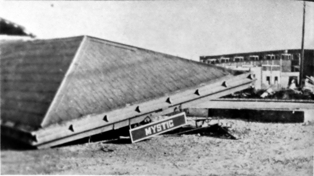 The Courant reported on 12/28/1905 that "the new depot is finished and occupied. The old depot will be used in the freight busines." Apparently, the "building boom" reported by the newspaper and the respectable amount of industry that it included was thought by the railroad to call for expanded facilties. The val photo at upper right is dated 5/31/1917 and the shot at lower left shows the covershed down after the hurricane of 1938. MYSTIC3, happily, survived and still serves Amtrak passengers today, as shown in the recent shots at lower middle and right. [REFS: CRC53.1905.28; HC/12/28/1905/14; HC/12/30/1905/15; HC/08/18/1976/40E; HC/05/22/1978/17D; HC/04/19/1979/52D]