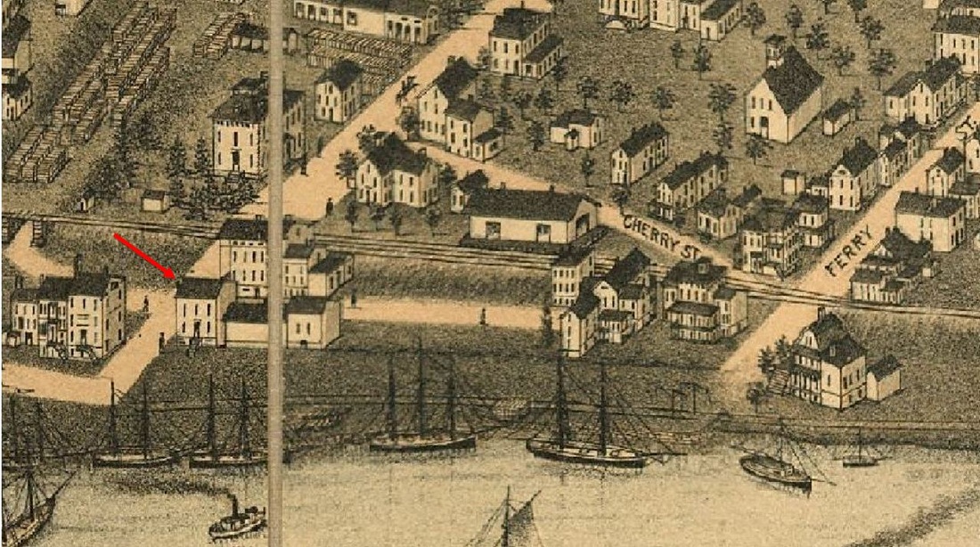 The 1882 Bailey bird's-eye map [click here] shows the 1848 depot standing north of the tracks, opposite the new 1881 passenger station. The cross-gabled style matches NORWALK1, STRATFORD1, and other early NY&NH depots, right down to the diamond window in the gable. According to a Palladium article on the progress of the new station, "... the old building is to be used as a freight house..." and so it is seen on the map. Milford would eventually get two purpose-built freight houses for the eastbound and westbound sides, with the 1890s four-tracking. MILFORD1 undoubtedly came down to make way for the westbound passenger station, MILFORD3. The wider area and the depot's location at the red arrow are shown on the 1852NH map at [2]. [REFS: NHDP/09/28/1881/00][rev050217]