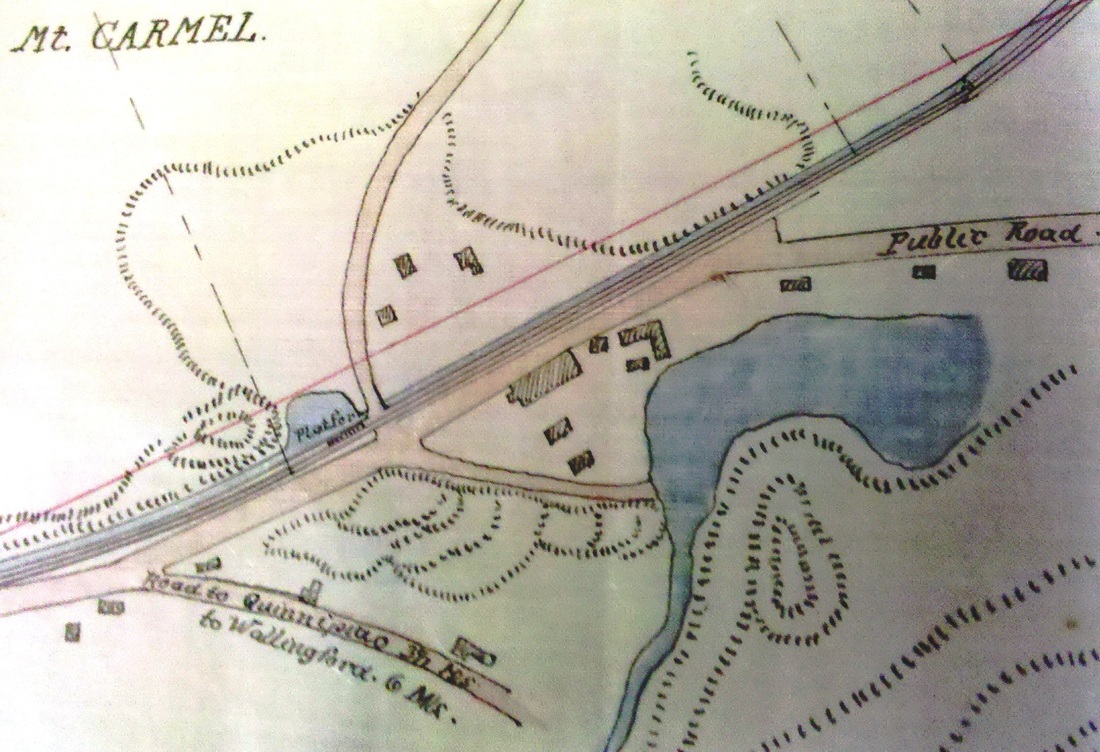 This was a simple platform, mostly used as a stop for workers at the Ives factory. Some of the buildings still stand at the bend in today's Rte. 22, seen on the map as the road to North Haven. This stop is not on the 1849TT. The 1870 map was created to show this stop and MOUNT CARMEL1, both up for abandonment at the time an actual station, MOUNT CARMEL3, was built at this location. Because of the proximity to the factory, this stop appears on most timetables as IVES. [REFS: R1.300][rev032313]