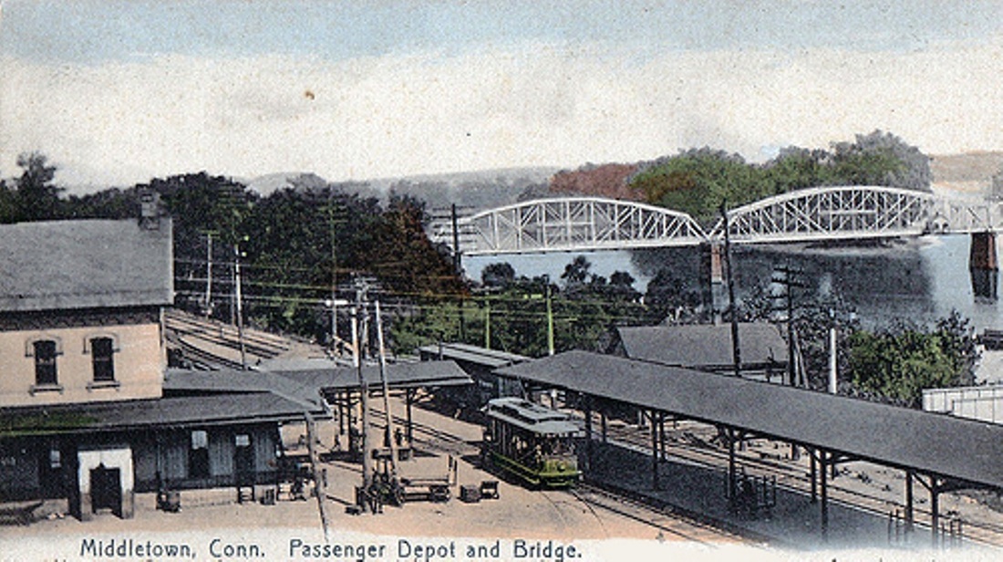 A union railroad station was constructed sometime after 1871 and before the 1874 Beers map at [1] where we first see it. As early as 1870, even as the NHM&W and the CV were both still under construction, the Courant reported that "the Middletown people are seriously discussing the question of a union depot for the three railroads running into that city." The Hackstaff property that "fronts on Main street, just south of the Catholic church, and extends from the street to the river bank" was said to be the best location. The Courant said late in 1871 that "the Air Line road is preparing to make a junction with the Valley railroad on the Hackstaff property... and it is expected that the connection will be made this week." This connection may well have meant the curious arrangement of two stub-ended tracks meeting a turntable in the northwest quadrant of the junction, a space cramped by the adjacent cemetery. Interestingly and never seen before, there are multiple copies of the Mr. Bailey's 1877 bird's-eye map of Middletown, the one at [2] misrepresenting the turntable as being only for the CV instead of connecting both roads. At any rate, the Constitution reported on 6/5/1872 that "on and after this week the 8,18 [sic] train on the Air Line road will run from the Connecticut River bridge [instead of Spring St.] to accommodate passengers on the first up train on the Valley road, which in the future will stop at the bridge." Regular trains began running to Willimantic on 8/12/1873 and shortly thereabout it is reported that "the platform of the Air Line and Valley railroads, at the junction, has been considerably lengthened. The old Hackstaff house will soon be used as a passenger depot. The view from the east window of the house will be an attraction to all travelers." The 1877 Bailey map at [2] says locator number 9 is the Union Railroad Station and we see the long covered platform and the smallish structure right at the junction. By 1874 we read that the Air Line "connects with all trains on the Valley road at Middletown junction..." and this would remain become an important transfer point between the railroads and street railways in Middletown for the next half century. The newspapers reflected public opinion about the inadequacy of the facilities here as early as 1881 when they said this was a "decidedly inconvenient" depot that, in use for less than a decade, "has outlived its day and generation." [REFS: CC/03/19/1870/01; CC/10/21/1871/02; MC/06/05/1872/02; HDC/04/28/1873/04; MDC/08/13/1873 /02; PP/11/00/1873/00; CRC21.1874.191; HDC/07/08/1874/04; NHER/04/25/ 1881/04; HEP/05/11/1881/00][rev031915]