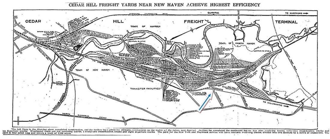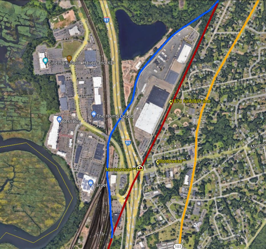 The New Haven, Middletown & Willimantic began running trains on 8/1/1870. This station in the town of North Haven was opened late in 1870 and a local committee raised money to grade the road to the new depot, likely Montowese Ave., and, by some accounts, to build the station as well. By March of the next year, we read that the "... people in the vicinity of the new station in the southern part of the town [North Haven] on the Air Line, viz. 'Montowese,' are about to erect a dwelling house and depot combined...." Thus, the two-story residential appearance of the structure is explained. The upstairs apartments were usually for the agent and his family. According to the Courant, the stop was named for "an old Indian chief who formerly dwelt thereabouts...." This choice of names had the benefit also of distinguishing it from the nearby NORTH HAVEN stop on the Hartford line. A post office was established here in June, 1871 with Wallace A. Robinson appointed postmaster. This event was a milestone for any village, amounting to federal recognition of the locale. The railroad put places on the map by creating population centers where there were none before, thus the wording that "... we see no reason why a large village will not soon be added to that section of our town." And the trains also brought the mail so the station was often the post office as well, with the agent wearing both hats. What was it like to stop here? A disgruntled visitor in January, 1872 says that "stepping into the 'waiting room' to get warm... we found a rusty stove without a pipe... no chairs... not even a man in the building to point you to the road to the village... a cold, cheerless depot...," for which he chided the locals for "lack of public spirit and private pride," which he hoped was not typical of North Haven hospitality. It is hard to believe this could be the case a year and a half after the railroad opened. If by chance this was the post office and the agent did live upstairs, it is unlikely that no one was around to meet the train. Of course, we do not know what 'staffing' was like in those early days. Could he have gotten off at tiny QUINNIPIACK? And why was he not blaming the company for operational deficiencies? Personal impressions aside, his assertions that this station opened in the fall of 1871 is off by several months and his claim that there was no depot at EAST HAVEN is also false. But, we digress! The historical photo at [1] perhaps dates to the 1890s when that dress style was in vogue. The valuation photo at [2] was taken on 8/21/1916. The station location in the northeast quadrant at the Montowese Ave. crossing is seen on the 6/30/1915 val map at [3]. The blue arrow on the 1921 Cedar Hill map at [4] shows the depot along the original NHM&W line. That location appears to correspond to the I-91 overpass built in the 1960s when the track was relocated slightly west due to the highway construction. This was still a flag stop in 1925 but is gone by 1928. Perhaps at some time therein, the station was moved a short distance east and rotated to face Montowese Ave. at the corner of Clark Ave. Our shot at [5] was taken in 2012 and Google maps still still show it standing. Front porches have obviously been added. The snippet from our Track 11 Google Earth map shows the old and new locations for the structure. The current alignment of the Air Line is in blue, the old right of way is red. The friendly folk at the North Haven Historical Society [click here] were very helpful in providing photos. [REFS: HDC/12/12/1870/04; CR/12/17/1870/04; MC/12/21/1870/02; SR/03/17/1871/08; BDA/06/17/1871/04; SR/07/21/1871/08; NHJC/01/26/1872/02: says incorrectly that depot opened last Fall, i.e. 1871; also that EAST HAVEN does not have a station; NHER/07/03/1872/02; HC/12/25/1921/22; 12/2/1925 Form 220 LWTT: yes; 11/18/1928 Form 200 TT: no][rev053117, 050922]