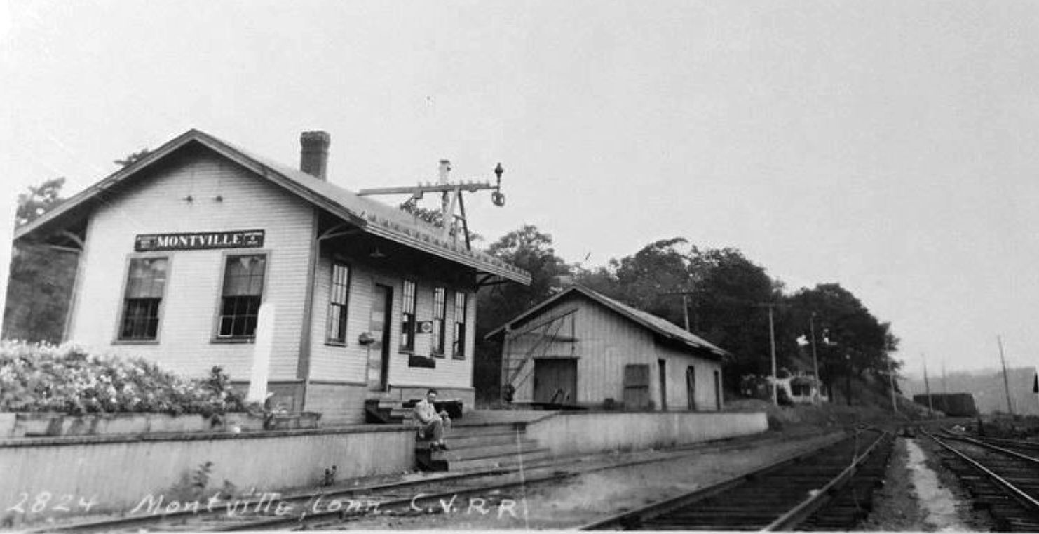 The foundation for a new combination depot was reportedly not laid for almost a year. In a Fifty-Years-Ago series in 1913, the paper is said to have reported on 9/21/1863 that "... preparations are being made to build a new depot and establish a telegraph at Montville station to replace the depot destroyed by fire some time since. The paper of 10/27/1863 said that "... the new depot at Montville station is nearly finished and will be ready for the reception of passengers in a few days. It is a decided improvement on either of the buildings previously used for that purpose, and is a credit to the road." Shot [1] is undated but has the old vertical board-and-batten exterior. The 1868 Beers map [2] shows the location where the depot stood along the river. Business must have been sufficient enough thereafter to once again build a separate freight depot and new car house in 1866, as reported in the Willimantic Journal; they are seen in the 1883 NLN real estate map [3]. Image [4] dates to the 1890s, since the 1874-built locomotive #175 only carried that number between 1890 and 1900. According to Bob Britten, former agent, this structure was clapboarded by the 1930s and it sported s a changed door-and-window arrangement and a new signal mast as well [5]. It looks Lewis H. Benton took his photo #2824 with Irving Drake seated on station steps in 1931, likely on 0906. Image [6] is probably from the 1950s and before this 100-year-old station was torn down in the late 1970s. Jim Murphy has an April, 1977 photo showing both buildings still standing in the Ambassador [3.11 (1994)]. The freight agency here and in NORWICH/W had been closed in 1972 in in favor of a new Serve-Centre computerized system. [REFS: HDC/10/08/1862/02; HDC/09/21/1863/02; HDC/10/13/1863/02; WJO/03/29/1866/54; HDC/11/05/1878/03; NMB/09/27/1913/14; NMB/11/01/1913/4][rev100318]