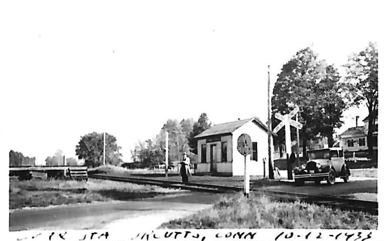 The val photo at [1] is dated 9/11/1916. There is a solitary figure seated on the steps and, though faint, you can see the paddle raised to signal the train that there is a passenger waiting. This flag station is not on our rev7/7/1912TT but does appear on the rev6/29/1914TT and the 1915 val map at [2]. Throughout its existence, no trains were scheduled to stop there. On our 11/18/1928TT, it is listed as the sole flag stop on the old HRR branch which was being served by one train daily in each direction and it is gone by the 2/8/1932TT after passenger service ended. The small shelter was put up for the comfort of visitors to the Garders, a couple who relocated here from New York and began to farm the land, sell produce, and run a modest vacation resort. Materials at the Monroe Historical Society, which has lots of railroad photos, say that the Garders bought the lumber and the NYNH&H provided the labor to build the small waiting station. An article in the Newtown Bee claiming that the station was partly dismantled and taken down in 1921 and then used as a storehouse on the farm property is only partially correct. The date is contradicted by the 10/18/1927 PUC photo at [3] and by the 1932 Bridgeport Sunday Post image at [4] showing Harry Garder (inset) reclaiming his structure to be used as "a granary" at that time. The couple is remembered today with the naming of nearby Garder Rd. Our colleague Kevin Daly at MHS has annotated the 1934 aerial map at [5] with the grade crossing and road realignments over the years at this interesting location. Locals recall taking the train to high school in Bridgeport while service still lasted. Kids gleefully raise the paddle in the 1920s photo at [7]. Just makes you want to go back to happier days! [REFS: BSP/03/13/1932/14; NB/07/08/1994/??; K56; NL22.4.9][rev061613, 101920]