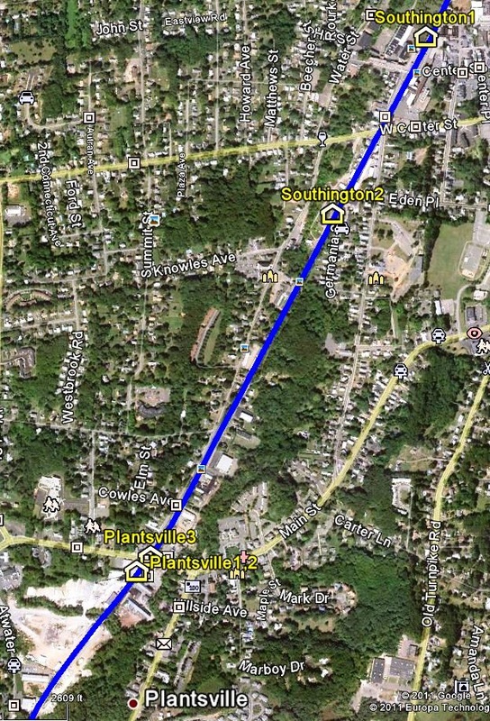 There are numerous mentions of this New Britain stop which was just west of CLAYTONS, the first of which references is the 1860 HP&F timetable shown at upper left. An 1867 article reported that the First Regiment arrived by train at this station and proceeded to set up their encampment tents a quarter mile east where they were visible also to the H&NH, a quarter mile further east. A 1/14/1873 NY&NE timetable shows regular- and flag-stop status for this station. The 1888-revised property map [middle] of later owner NY&NE shows a small structure in the southwest quadrant of the grade crossing at today's Allen St., just west of East St. We have put the red X there on the 1893 map at right. The newspapers reported a variety of incidents here and accidents at this busy intersection occurred in 1882, 1885 and 1897, the middle one saying that a woman was struck by a train and "thrown under the depot." The photo at lower left is from an 8/3/1908 newspaper article about yet more fatalities, this one claiming three lives with the mutilated bodies found at the Xs which our red arrows point to. The last listing for PRATTS as a station is in the 1886 NY&NE A Book of Useful Information in Regard to the Cities and Towns on its Line and it does not appear on an 1891TT, the next we have access to. It probably was superceded by the CLAYTONS station, which was .8 miles east and just across the line in Newington. We have no photo of whatever structure stood at PRATTS. [REFS: CC/08/31/1867/02; CC/12/04/1869/04; HPF 9/18/1872TT; HDC/04/23/1873/02; HDC/08/17/1871/01; HDC/09/29/1882/04; HDC/08/25/1885/02; HDC/11/11/1886/03; HC/12/31/1897/08; SR/06/30/1905/12][rev091813]
