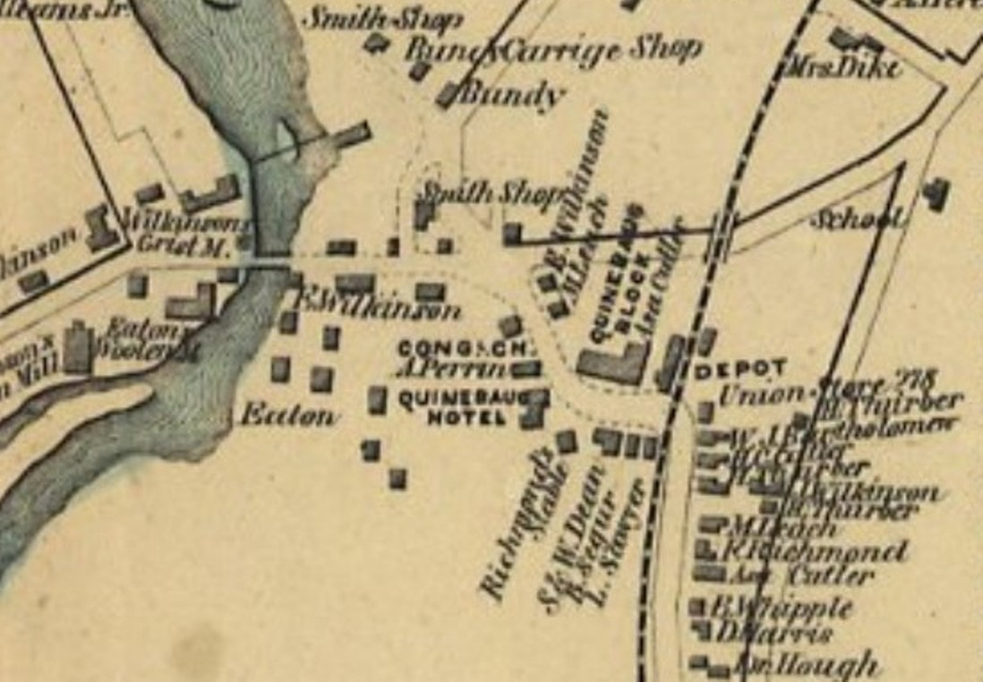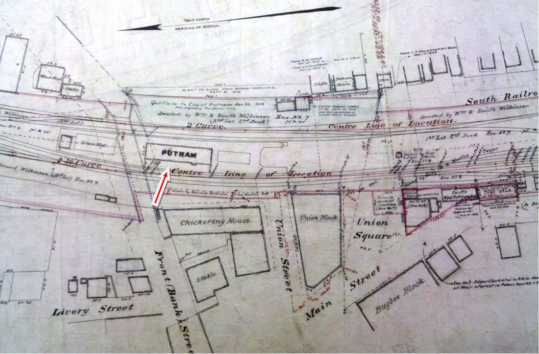 The image at [1] is a side panel on the 1856 Windham County map. It suggests that the Quinebaug House served as first station here, for passengers at least. Early railroads often did this to save the cost of building their own depots, as we have seen at STEPNEY, MERWINSVILLE, CANAAN and elsewhere. The N&W arrived here late in 1839 when the event was joyfully welcomed by the village "... though little foreseeing the revolution it would bring about. The first depot master at the Pomfret Factory was Mr. John O. Fox, removing thither from West Thompson. Amasa Carpenter, from North Woodstock, occupied part of the building, carrying on with John O. Fox a thriving business of grain and groceries." Early timetables such as the 1851 American Railway Guide at [3] show this stop as POMFRET or POMFRET FACTORY for the manufacturing enclave adjacent to the township to the west. This hamlet was originally known as Rhodesville and was actually in the southernmost part of Thompson until the township of Putnam was created in 1855 out of lands from Pomfret and Killingly. The N&W was the sole railroad serving this locale until the arrival of the BH&E in 1868. The Courant reported in April that there seemed to be no cooperation with the N&W "... in the rection (sic) of a [union] depot in Putnam," and the BH&E's 1868 freight depot was used temporarily as that road's passenger station. Cooperation was secured with the BH&E lease of the N&W, effective 2/1/1869 and by March it was reported that "the railroad business at Putnam is to be consolidated. The passenger and express business is to be done at the lower, or N. W. depot, and the freight business at the new Boston, Hartford and Erie depot." Our red arrow on the snippet from the 1877 Bailey map at [4] shows this freight structure just below May St. Many thanks to local historian Bill Zamagni of Putnam for help with this entry and continuing contributions to TCS. [REFS: HDC/04/04/1868/04; HDC/07/24/1868/02; HDC/08/07/1868/02; HDC/09/05/1868/02; CC/02/13/1869/02; HDC/03/06/1869/04][rev071317, 122422]