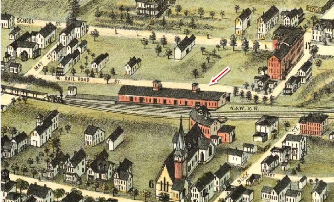 The first station that the HP&F built here was in 1856, just after the railroad opened, along with MOOSUP1 and STERLING1, all three mentioned in the early annual reports. As shown on the 1856WC, the new depot was at the junction where the new road crossed the N&W on the western outskirts of the village. This important junction was brought under the full control of a single company when the HP&F leased the N&W in 1869 and we assume that the earlier N&W depot was then given up and this one at the junction was shared thereafter by both lessor and lessee. While we do not yet know the fate of this depot, it would be replaced in 1881. [REFS: HPFAR6.1855.7; HPFAR7.1856.9; NA/06/03/1868/04][rev020313]