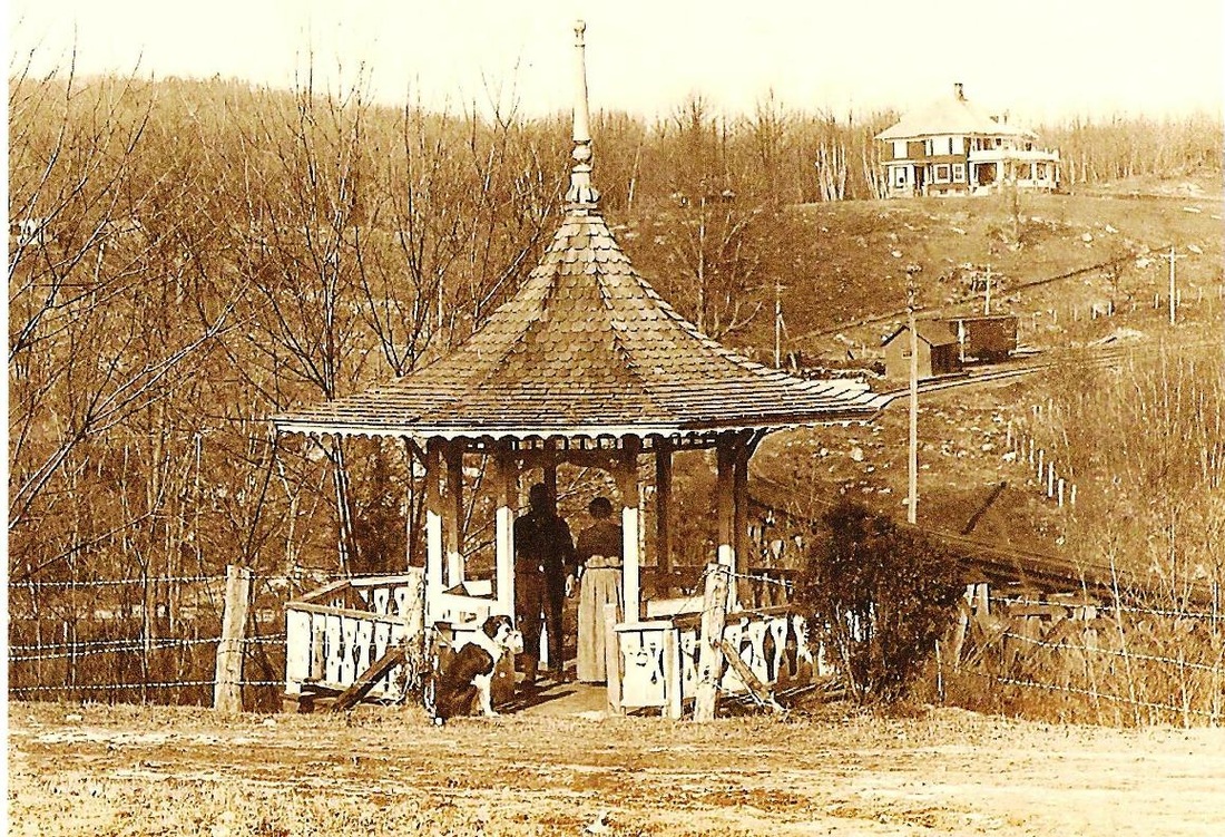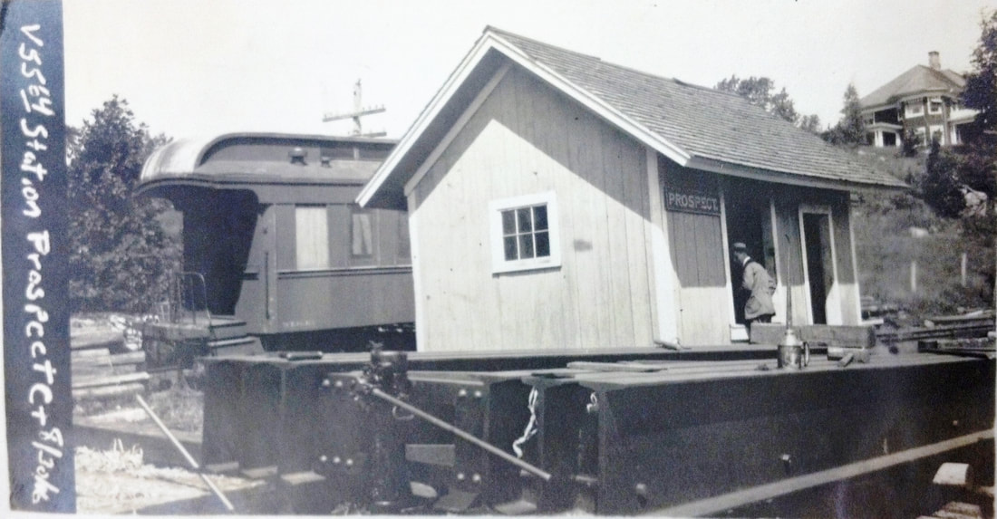 This station on the MW&CR is shown by the blue arrow on the 1892 topographic map in between WEST CHESHIRE and SUMMIT. We are pretty sure that the tick mark is a bit misplaced since the property owner across what is now Rte. 68 testifies to the fact that the station was on his land. It stood where the capital on the letter C is on the map. In the 8/30/1916 val photo at left, the corner of his 1900s-era home is visible and it still looks out over the former station site today. Closer examination of this photo leads us to believe that the valuation photographer has caught the station up on some kind of moving device about to be shunted perhaps onto a flat car. Passenger service would end in 1917. The coach is actually on the stub-ended siding behind the station, where the box car appears in the panoramic photo at right. That shot looks north from the Laurel Grove hotel resort, known earlier as Dunham's Grove, a popular picnic spot that generated some traffic for the railroad. Perhaps the blue arrow indicates a flag stop for the grove that was perched on a high bluff and separated from the PROSPECT station by a deep ravine that the railroad crossed on the curved trestle seen in the photo.