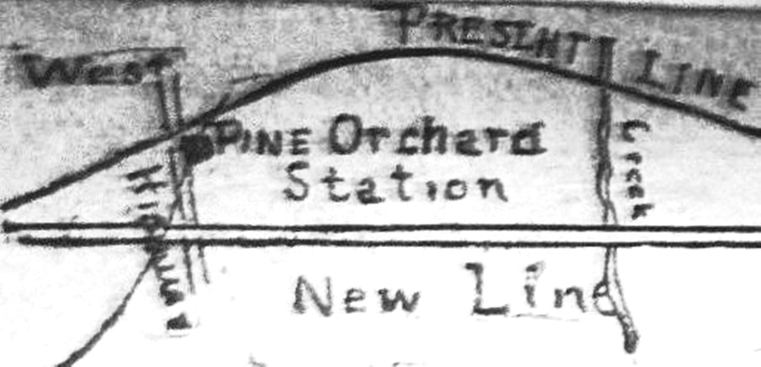 However trains had been serving people here "for over 20 years," the earliest newspaper mention we have found for this stop is in an 1880 list of stations though it is not seen in the travel guides or railroad timetables. The RRMs first show it in 1884 and the GHD in 1885. The 1886 Sheldon correspondence, seen at [4], says that locals had provided the first "depot and platform... until one year ago last June [1885] when the Company built a platform and depot," likely the one pictured in 1888 at [1]. A Register article verified that when it said that... "The new station on the Shore Line road at Pine Orchard has just been completed. It is conveniently arranged and the people at the Orchard are quite proud of it." Material gathered in August, 1886 for the first Connecticut State Register and Manual publishing such data was synopsized in the newspaper, saying that there were for this town stations at Branford and Stony Creek and that "... some trains stopped at Pine Orchard during the summer..." We also read in July, 1886 that hotel proprietors had met with railroad officials in hopes that Pine Orchard would be made a "regular way station during the summer months, where tickets can be bought and trunks checked, which cannot be done at present. It is thought that many more passengers are carried to and from this place than at other stations with much better facilities." According to timetables and newspaper reports that 'regular' status during the four-month season was not achieved until 1897. The 1892 newspaper map at [2] shows the station in the southeast quadrant of the old grade crossing. The red arrow on the real estate atlas snippet at [3] shows the location in the northeast quadrant on the new ROW, some 800 feet south of the old location at the blue arrow. While we have not found written proof of this yet, the NYNH&H seems to have taken this opportunity to abandon PINE ORCHARD2 and build the decent-sized depot in our next entry. [REFS: 1871-1881TTs; NHER/04/01/1880/01; NHER/07/09/1886/01; NHER/07/30/1886/03; RRL:8/6/1886; NHER/08/10/1886/04; NHER/08/10/1886/04; NHER/11/17/1887/01; NHER/07/26/1892/01; NHER/06/02/1897/05; NHER/06/02/1899/08; R2.30][rev0227 15, 123118]