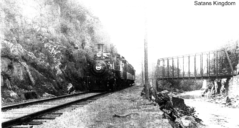 Just east of here was the fearful canyon known as Satan's Kingdom, which both railroads had to blast ledges through. Trains are heading to Collinsville in both photos; a Canal line train is seen in [1] on the west bank of the Farmington River and at [2] a CW consist is taking the east bank. Oh, how we wish we could have ridden across that bridge! On several occasions, the Hartford Camera Club 'took the cars' to capture images of exotic locales along rail lines and this one certainly qualified, probably on 5/30/1892 when a stop was made enroute to TWIN LAKES. The men are walking east on the Canal line in [3], the one in the center carrying the equipment is reportedly F.H. DeMars, noted Winsted photographer. [REFS: HDC/11/14/1871/04; WH/12/15/1871/02; HDC/12/21/1871/02; CW/NYNE1880; HC/05/31/1892/05; WH/11/20/1895/08; FVH/12/30/ 1937/01; D26][rev062715, 021520]