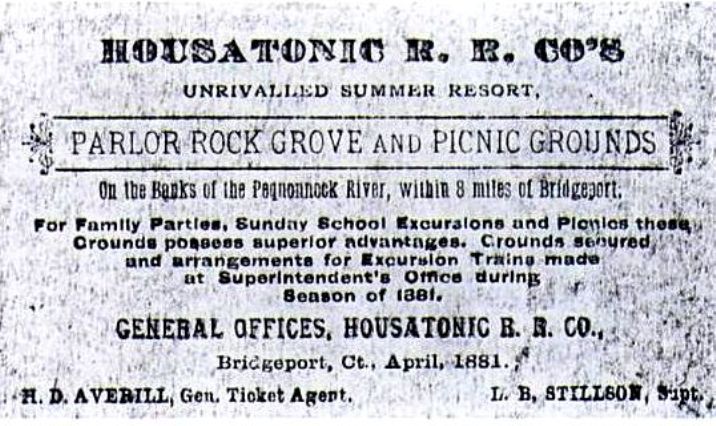 Akin to the D&N's BROOKSIDE PARK and the NRR's HIGH ROCK GROVE, PARLOR ROCK in Trumbull seems to have been established by the HRR in 1879, although excursions to this rocky grotto date probably back to the beginning of the railroad; one is noted in the newspaper in 1851. Success as an official destination was immediate and trains of 10 or more cars were not uncommon, with crowds coming from as far as Pittsfield. Even more traffic was generated from New Haven and the Naugatuck Valley after the NH&D connected with the HRR at Botsford in 1888. The view at [1] looks north at the 100-ft platform and shows a small building at our red arrow, enlarged at [2], that may well be the depot. It does correspond to the 9A location on the facilities map at [7] and we can also see the banister for the stone steps leading up to station. The image at [3] shows a train passing the station area. The 1868 map at [4] shows the grove containing the namesake riverine boulder with the parlor-like seat indentation, its fame already well established. In August, 1887, a huge 28-car train brought 4,000 Elks for their state picnic and the NYNH&H held an employee outing here as well, in spite of deteriorating relations with the HRR. The piece de resistance was the announcement of "the biggest toboggan slide in New England," likely the brainchild of the industrious HRR Vice Pres. William H. Stevenson. Elevators were reportedly going to transport people to the top of the ramp that was to be lined with ice cakes cut from Lake High-High to propel people clear across the frozen lake surface. Though we note the toboggan is facing away from the lake on the facilities map(!), electric lights costing $1,500, steam heat, and refreshment stands were ready for the slide's opening on 2/9/1888. With ice skating and ice polo and heated pavilions for roller skating and dancing, Parlor Rock was made into a lucrative year-round attraction and it would continue to be popular even after the HRR was taken over by the NYNH&H in 1892. In that same year a tip from the Long Hill liquor agent led to a police raid and the confiscation of beer from outraged Knights of Pythias picnickers. Trumbull reportedly went 'dry' shortly thereafter. This, as well as dwindling crowds due to competition from Bridgeport's Pleasure Beach and West Haven's Savin Rock, persuaded the NYNH&H to close the park in 1898 and the buildings were dismantled by 1908. According to the Trumbull Historical Society, trains still brought teams to use the baseball field until 1913. By the time that the 6/30/1915 val map at [6] was drawn only the large parcels that presumbly defined the PARLOR ROCK grounds are seen. Parking for the short trek on the Pequonnock Valley Greenway, the former HRR, is available on Whitney Ave., about 1,000 feet south. This was the site of the former BEERS MILL, later LONG HILL, station, which is marked in yellow on the 1868 map. [REFS: CC/08/23/1851/02; B822 (1872); WH/09/02/1872/03; MDC/08/06/1874/02; NHER/04/17/1879/04; NHER/08/26/ 1879/01; NHER/12/24/1880/01; NHER/06/06/1885/04; NHER/06/21/1887/01; NHER/07/29/1887/04; NHER/07/30/1887/04; NHER/08/11/1887/01; NHER/ 08/31/1887/01; NHER/11/08/1887/01; NHER/02/08/1888/04; NHER/09/05/ 1888/04; NHER/07/06/1892/04; NHER/08/17/1893/04; B890; NL10.1.2][rev071415, 080622]