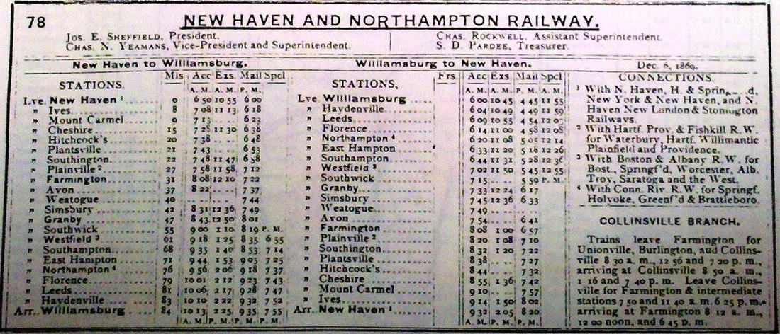 This was a hitherto unknown stop, presumably short-lived, in Branford. The NH&NL opened in July, 1852 and the image at left may be its first timetable. Neither the 1852NH map at middle nor the 1868 Beers map at right show a depot in the village that was just west of the Branford station. What structure stood here, if any, and how long the stop was in use are unknown. It is seen on no other timetable or map. [rev082913]