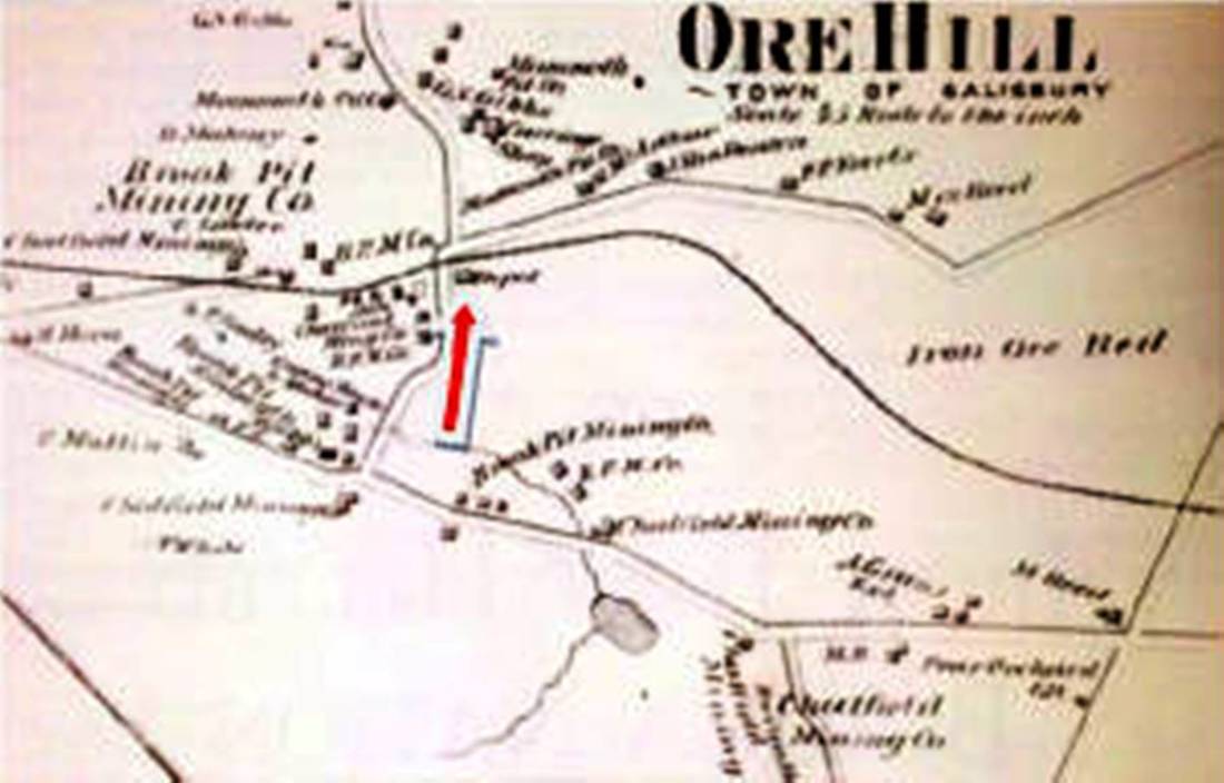 This was an original timetable stop in the town of Salisbury when the CW opened in 1871. In the photo at [1] the structure at right looks to be ORE HILL1 on the south side of the track, as shown on the 1874 map at [2]. It sits just east of the road that would become U.S. Rte 44. The full image is a stereo card and has an upside-down inscription at the top that reads Depot & PitA no. 129. It does not actually say Ore Hill but it fits here. The photographer is unknown but we assume that the 129 is the photo number in a collection owned by F.H. DeMars of Winsted CT, himself a prolific photographer. Pit A refers to the deep ravine across the street where ore was dug out of the earth. Matching it with the image at [3], the date would also then be 3/24/1877. The depot style does match TACONIC, nee CHAPINVILLE and, if the 1880 NY&NE appraisal of CW assets is taken into account, this depot is valued exactly the same at $1800. Construction reportedly started on 9/9/1872 with "... breaking ground preparatory to building a new depot. It is to be 30x40, with ore bed offices, and scales for weighing ore in the same building" and it was nearing completion by November. An 1873 Lakeville Journal article says that the "... new depot recently erected is all that could be asked for; it is a large building situated in the centre of the village, is about 40x50 feet... which gives room for a good sized store house [freight room?] and two other rooms of likewise dimensions. The one is used for the accommodation of passengers, and the other for an office for the Brook Pit Mining Co. The railroad company could well afford to give us a building like this, as we can boast of sending more freight from this place than any other station between Hartford and Millerton, during this past year." The 1874 map at [2] shows the sizeable community here and the configuration of the roads and mines. Our red arrow points to the station. The photo at [3], another stereo card in the DeMars collection, has an upside-down inscription similar to [1]; it reads Ore Hill March 24 1877 No. 128. It shows a westbound train with box car and coach crossing over the ore pit. The spectacular 300-ft long, 70-ft high bridge, noted in several newspaper articles, is first mentioned in June, 1872 when it was said that here "an opportunity is offered to inspect the depths of Mother Earth." An 1874 Winsted Herald story reported a horse making such an inspection and walking of his own accord across the bridge on the planks in the center of the rails! Tourism and animal shenanigans aside, the choice of the ROW going over the pit has to be seen as somehow necessary or advantageous for the considerable expense it must have involved. According to the Poughkeepsie Eagle, the bridge was eliminated in July, 1889 when the line was relocated around the southern side of the pit. This apparently left ORE HILL1 on the abandoned line and and it was razed in 1900 when the Lakeville Journal said "the old depot at Ore Hill has been torn down and removed by the railroad company." [REFS: HWT/06/08/1872/02; CWN/06/14/1872/02; HDC/06/18/1872/02; CWN/08/02/02/1872: new 20x100-ft platform and new side track; CWN/09/09/1872/02; LJ/05/23/1873/02; WH/11/06/1874/03; HDC/11/26/ 1874/01; CWN/01/07/1876/02; NHER/02/12/1887/04; PEA/07/17/1889/04; CRC37.1890.34: hearing last spring for new ROW to eliminate bridge; CWN/05/13/1897/03; SR/04/22/1899/12; HC/06/15/1899/05; NHER/06/15/1899/10; LJ/09/01/1900/05; HC/06/27/1937/D1][rev020918, 111822, 121322]
