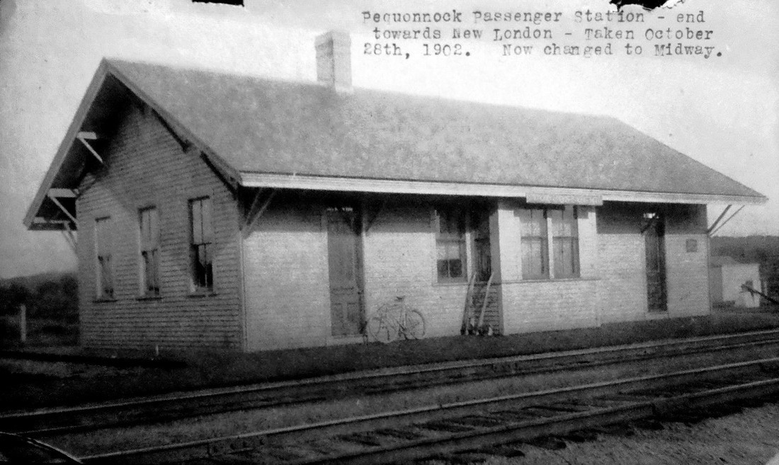 According to the railroad commissioners, this depot was built in 1901 to replace the earlier one that had burned. They also reported that an extensive icing plant was put up at this time, a forerunner of the expansion of facilities to come. The image at [1] says correctly that the name was changed to MIDWAY after 10/28/1902. In fact, the renaming occurred in December, 1904 when the NYNH&H completed a major freight yard and engine facility at this half-way point between Boston and New York. MIDWAY station is seen at [2] on the north side of the tracks and east of Depot Rd. with the railroad hotel behind it. The ICC valuation photo at [3] is dated 5/13/1917. The station site today is where the electrical box [4] is along the NEC main. Today, an Amtrak maintenance plant occupies some of the land and some has been sold off for residential development, with telling street names like Midway Oval [6]. The undated map sheet at [7] shows the station west of the village road. A 1935 map in Ed Ozog's 1981 Shoreliner article [p18] shows the station on the west side of the road. According to a New London Day article of January, 1917, the station was being moved at that time as part of an expansion of tracks and facilities. According to Carol Kimball, the depot was jacked up and moved eastward across Depot Rd., workers accessing the structure with a 12-ft ladder while it was up in the air. Kimball says further that the MIDWAY station was boarded up early in 1926 due to declining passenger traffic and it was "later taken down." A 1939 Day article was headlined "Midway Yard Now in Hands of Wreckers" and so progress made by electrification in the West End had made this steam-era 'midway' stop a thing of the past. [REFS: 1858TT; 1871TT; CRC49.1901.19; CRC51.1903.20; NHAR33.1904.6; HC/12/02/1904/02; NHAR34.1905.7; NLD/01/15/1917/08; NLD/07/16/1917/08; NLD/02/04/1939/09; SL12.2.15; NL10.1.10; C171; Kimball, The Poquonnock Bridge Story, p76,77][rev121216, 042523]