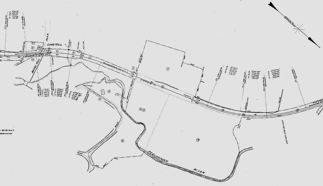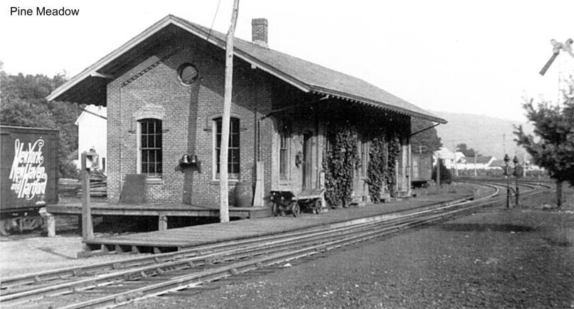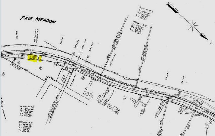 Chronologically, the second station in this village was built by the CW. The Courant said this was a flag stop initially but the Winsted Herald reported that a depot here was almost complete late in 1871 when the railroad opened. The real estate map of that same date at [1] seems to show the location right at the Albany Tpke., as Bob Lord asserts, though with no building shown yet. A 1937 newspaper article verifies this as Gilman Crossing and that surname is seen on the map. Note that an arrow points to the 1877 NH&N depot pencilled in a little farther to the west. By the 1874 Beers map at [2] the CW depot is clearly indicated but actually on the wrong track. The swapping of ROWs between the CW and the NH&N, both building in 1870, is mentioned in the newspapers and may be responsible for confusion on the map, which also does not indicate the crossover. Mr Bailey's 1878 map at [3] does us an unfortunate injustice here by cutting off the building that might have been PINE MEADOW/C1 depot where our arrow points at middle left. The 1880 NY&NE appraisal of CW property said there was a small structure here to serve both passengers and freight valued at $175, compared to BLOOMFIELD which it appraised at $1500. The fate of this station, when it was replaced by PINE MEADOW/C2 in 1894, is unknown.