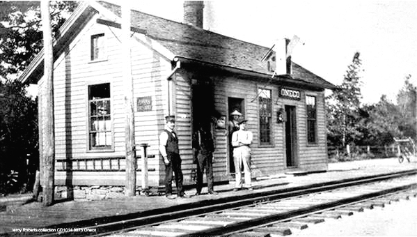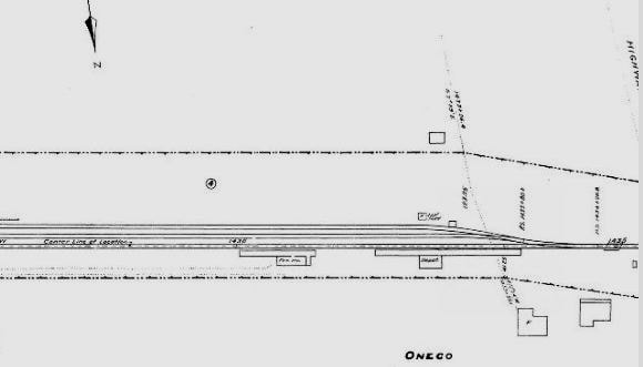 This depot is the only one ever seen for this village. While both of the photos are undated, the people look dressed for the 1900s and that is when this structure may have been built. Note that the compass arrow inicaticates that the station sat on the north side of the track. The extra tracks on the 1915 val map are atypical for a station of this size and may have had something to do with the 1873 quarry spur, although that itself is no longer seen. The granite business here predates the Civil War and, as late as 1899, the Connecticut railroad commissioners permitted a grade crossing at Norwich Tpke for a track to the quarries and stone-crushing plant of the Oneco Granite Co. The 1948 article already spoken of also bemoans the loss of this economic activity, and says mournfully that "Even the Oneco Railroad Station is gone now, as similar rural structures throughout the state have vanished, giving away [sic] to modern motor transportation." The 1938 SSRR lists this station as retired and subject to sale or removal. [REFS: NHER/04/13/1899/07; HC/02/08/1948/04][rev022421]