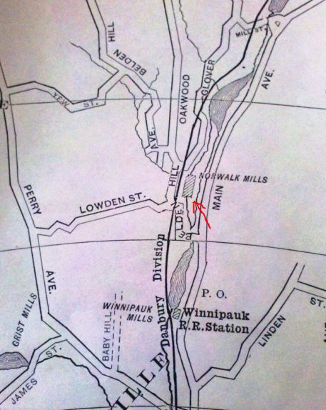 This station was in Norwalk just above WINNIPAUK on the Danbury line. Al Weaver's scrutiny clarified that the road rising behind the shelter is the Merritt Parkway. It still crosses over the track today, marked by the red arrow in the upper left shot. Ironically, the current map at bottom right shows precisely where the OAKWOOD AVENUE stop was, labeling it mistakenly as today's MERRITT 7 which is actually a bit farther north. We do not know where the street name came from; today it is Glover Ave. With the WWII clue on the photo at upper middle, we checked employee timetables for the war years to find this station shown from 1943 to 1945. The manufacturing history of this area goes back at least to the Civil War-era Norwalk Mills, which had fallen on hard times by 1912 when the 36-acre site with the buildings, canal, mill pond and water rights were rumored to be considered for purchase by the NYNH&H for the purpose of electrifying the Danbury line. The location is shown at the red arrow on the 1905 map snip at lower right. The Norwalk Tire and Rubber Co. took over the property in 1914 and began to make products for civilian and military use. The older mill complex is seen to the north in the photo at lower middle with arrows pointing out the catenary towers for the electrification that finally debuted in 1925. The lone 7:27 a.m. train, perhaps used mostly by employees while business boomed during the war, was probably complemented by an evening return trip. The tire company would tout 'Victory camelback' retreads to conserve rubber supplies during the war but would be sold in bankruptcy by 1950. This area experienced a renaissance around 1965 when a Courant article said that the property, then owned by the Armstrong Rubber Co., had been sold to the Caldor department store chain which was renovating the complex and tearing down the older buildings for its new operations base. Founded in 1951, the pioneering discount chain enjoyed phenomenal growth hereafter that would see it operating 166 stores at its height in 1994. By 1999, the pendulum would swing to bankruptcy and the chain would close all its remaining stores. Cornwall does not mention OAKWOOD AVENUE but instead calls the station in this area NORWALK MILLS. [REFS: NH/06/04/1912/01; HC/03/24/1914/03; NYT/04/03/1942/24; NYT/02/05/1949/07; NYT/07/14/1950/42; NYT/09/26/1957/25; HC/05/28/1965/47; HC/06/06/1965/23D; SL17.4.24][rev033113, 121422]